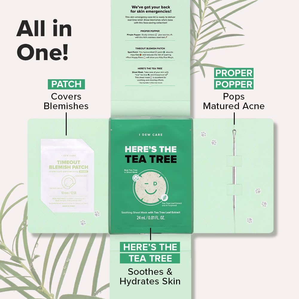 About this item WHO IS I DEW CARE: Seriously Fun Skincare. We make fun formulas that seriously work. Smile-inducing K-beauty for her, him, they, and everyone. ABOUT BLEMISH FRANCHISE: Get clearer and healthier-looking skin with this ultimate collection. Say āTimeoutā on bad skin days and hello to this skin emergency care kit that is ready to deliver real-time relief. NO MORE PICKING AND POPPING: Introducing a clever way to tackle your skin concerns. Get clear-looking skin with this all-in-one kit that comes with three skincare essentials for acne-prone skin. PROPER POPPER (PIMPLE POPPER): Keep your face free and clean with Proper Popper! This dual-tipped pimple popping tool helps remove blackheads, whiteheads and blemishes with a gentle touch. Say bye bye to skin problems with just a pop! TIMEOUT BLEMISH PATCH ORIGINAL & HAPPY PAWS: Sweep it under the patch! This spot patch with tea tree leaf oil conceals blemishes easily and helps relieve skin worries. See more product details,WHO IS I DEW CARE: Seriously Fun Skincare. We make fun formulas that seriously work. Smile-inducing K-beauty for her, him, they, and everyone,ABOUT BLEMISH FRANCHISE: Get clearer and healthier-looking skin with this ultimate collection. Say āTimeoutā on bad skin days and hello to this skin emergency care kit that is ready to deliver real-time relief,NO MORE PICKING AND POPPING: Introducing a clever way to tackle your skin concerns. Get clear-looking skin with this all-in-one kit that comes with three skincare essentials for acne-prone skin,PROPER POPPER (PIMPLE POPPER): Keep your face free and clean with Proper Popper! This dual-tipped pimple popping tool helps remove blackheads, whiteheads and blemishes with a gentle touch. Say bye bye to skin problems with just a pop!,TIMEOUT BLEMISH PATCH ORIGINAL & HAPPY PAWS: Sweep it under the patch! This spot patch with tea tree leaf oil conceals blemishes easily and helps relieve skin worries