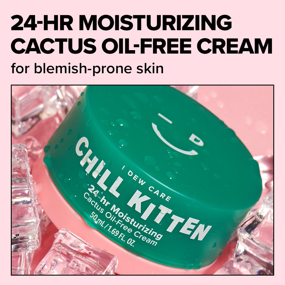 About this item WHO IS I DEW CARE: Seriously Fun Skincare. We make fun formulas that seriously work. Smile-inducing K-beauty for her, him, they, and everyone. CHILL-OUT: Chill your skin out with our calming, moisturizing, and cooling Cactus Oil-free Moisturizer! Comes in a 50ml (1.69 fl oz.) tub. CHILLIN' LIKE A KITTEN: The fragrance-free lightweight and oil-free gel texture soothes the skin and gives an instant cooling effect, leaving your skin chillin' like a kitten. (Please note that though fragrance-free, the product may give off a scent due to its botanical components) CLINICALLY TESTED: In a 24-hr moisturizing and soothing test, 100% said the product left skin feeling soft or smooth, and the product felt light-weight on skin. VEGAN, CRUELTY-FREE, IDC STANDARDS: This product is formulated with IDC Standards. Formulated without parabens, sulfates, & phthalates. Packed with love in FSC certified packaging. See more product details,WHO IS I DEW CARE: Seriously Fun Skincare. We make fun formulas that seriously work. Smile-inducing K-beauty for her, him, they, and everyone,CHILL-OUT: Chill your skin out with our calming, moisturizing, and cooling Cactus Oil-free Moisturizer! Comes in a 50ml (1.69 fl oz.) tub,CHILLIN' LIKE A KITTEN: The fragrance-free lightweight and oil-free gel texture soothes the skin and gives an instant cooling effect, leaving your skin chillin' like a kitten. (Please note that though fragrance-free, the product may give off a scent due to its botanical components),CLINICALLY TESTED: In a 24-hr moisturizing and soothing test, 100% said the product left skin feeling soft or smooth, and the product felt light-weight on skin,VEGAN, CRUELTY-FREE, IDC STANDARDS: This product is formulated with IDC Standards. Formulated without parabens, sulfates, & phthalates. Packed with love in FSC certified packaging