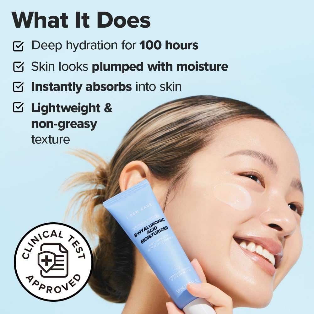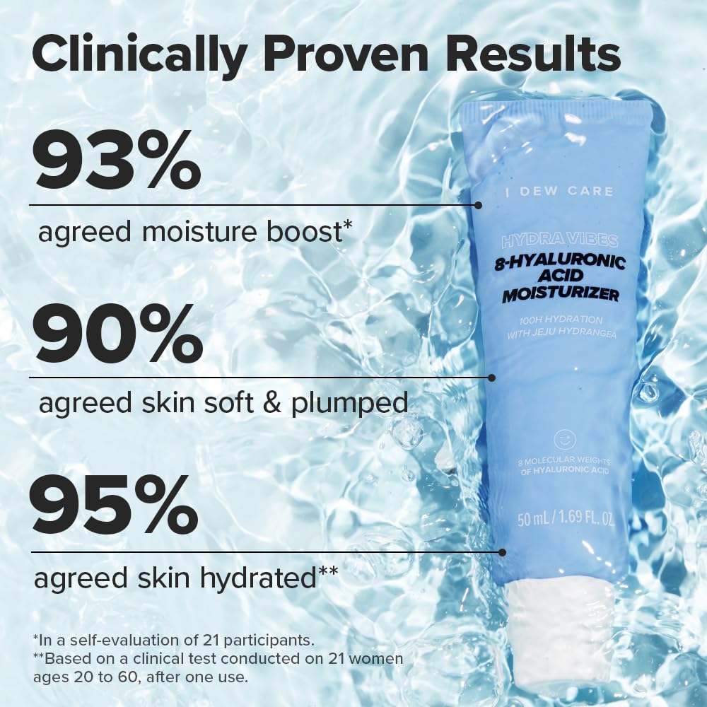 About this item Who is I Dew Care: Seriously Fun Skincare. We make fun formulas that seriously work. Smile-inducing K-beauty for her, him, they, and everyone. About Hydra Vibes Franchise: Experience the ultimate in skincare with our Hydra Vibes Collection – giving hydration and good vibes, revitalized, and smooth skin that lasts up to 100 hours! Up to 100 Hours of Hydration: Hydra Vibes 8-Hyaluronic Acid Moisturizer provides a revitalizing surge of moisture, promoting healthy-looking skin. Comes in a 50ml / 1.69 fl. oz tube. Jeju Hydrangea Extract: Sourced from South Korea's Jeju Island, this moisturizer includes Jeju Hydrangea Leaf Extract known for its hydrating and soothing properties. Fast-Absorbing Formula: Lightweight, non-greasy finish moisturizer texture feels light on the skin and leaves no sticky residue. A great add-on to your daily routine for an extra boost of moisture. Dewy & Healthy-looking Skin: Enhance your beauty regimen with this product to combat dryness and plump skin with moisture. Before application, apply your favorite facial serum to boost hydration. See more product details,Who is I Dew Care: Seriously Fun Skincare. We make fun formulas that seriously work. Smile-inducing K-beauty for her, him, they, and everyone,About Hydra Vibes Franchise: Experience the ultimate in skincare with our Hydra Vibes Collection – giving hydration and good vibes, revitalized, and smooth skin that lasts up to 100 hours!,Up to 100 Hours of Hydration: Hydra Vibes 8-Hyaluronic Acid Moisturizer provides a revitalizing surge of moisture, promoting healthy-looking skin. Comes in a 50ml / 1.69 fl. oz tube,Jeju Hydrangea Extract: Sourced from South Korea's Jeju Island, this moisturizer includes Jeju Hydrangea Leaf Extract known for its hydrating and soothing properties,Fast-Absorbing Formula: Lightweight, non-greasy finish moisturizer texture feels light on the skin and leaves no sticky residue. A great add-on to your daily routine for an extra boost of moisture,Dewy & Healthy-looking Skin: Enhance your beauty regimen with this product to combat dryness and plump skin with moisture. Before application, apply your favorite facial serum to boost hydration