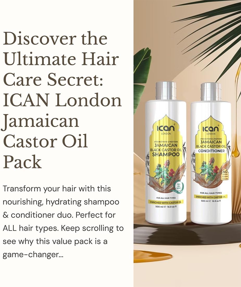 Product description ican London Jamaican Cator Oil Anti-Dandruff & Itch Relief Formula Shampoo & Sulfate free conditioner 500ml x 2 Directions Apply to wet hair, lather, and rinse thoroughly,jamaican castor oil shampoo 500ml + sulfate free conditioner 500ml,anti-dandruff itch relief formula,nourishing and moisturizing