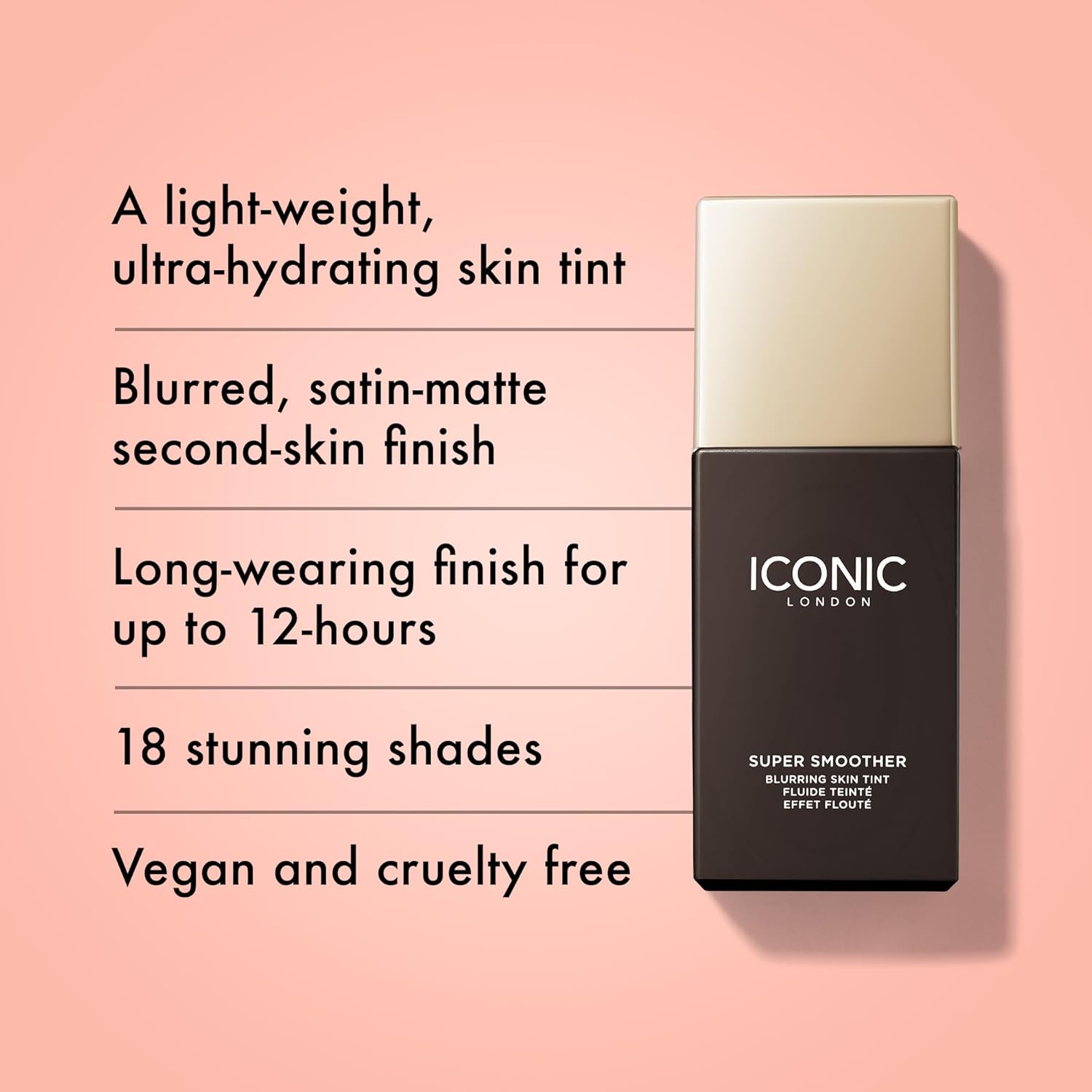 Directions Smooth 1-2 pumps of the product over your face and blend well for an even, flawless finish,Airbrush Effect: Our brand- blurring Super Smoother skin tint delivers a weightless veil of light to medium coverage with a luminous, multi-dimensional, second-skin finish,Long Wear: Stays put for hours without ever looking patchy or caked on. Just fresh, blurred hydrated skin. This lightweight, ultra-hydrating foundation, delivers a blurred and flawless, satin-matte second skin for up to 12 hours,Enhances your complexion: Super Smoother hydrates like a hero while delivering light to medium coverage. Thanks to its active ingredients, this make up base moisturises, plumps up and softens skin,Premium Ingredients: Enriched with plant-derived amino acids (aka vegan collagen!) which hydrate and condition skin. The pea extract promotes skin elasticity and firmness, while the peach flower extract protects the skin against radicals,Cruelty- and 100 Percent Vegan: Look good and feel good! The ICONIC Skin Tint is 100 Percent Vegan and Cruelty-,Age Range Description: Adult