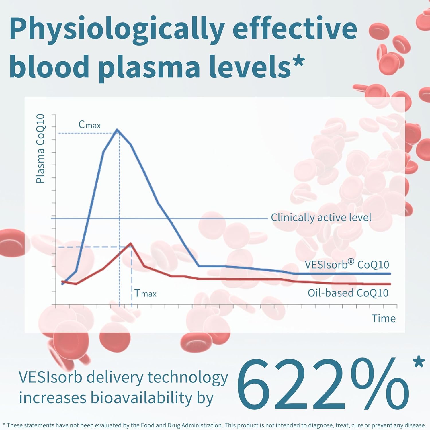 ONE-A-DAY WITH ALL-DAY ACTION: to benefit from ubiquinol, blood plasma concentrations must remain high. Offering 622% increased bioavailability, VESIsorb optimises the benefits of CoQ10 supplementation