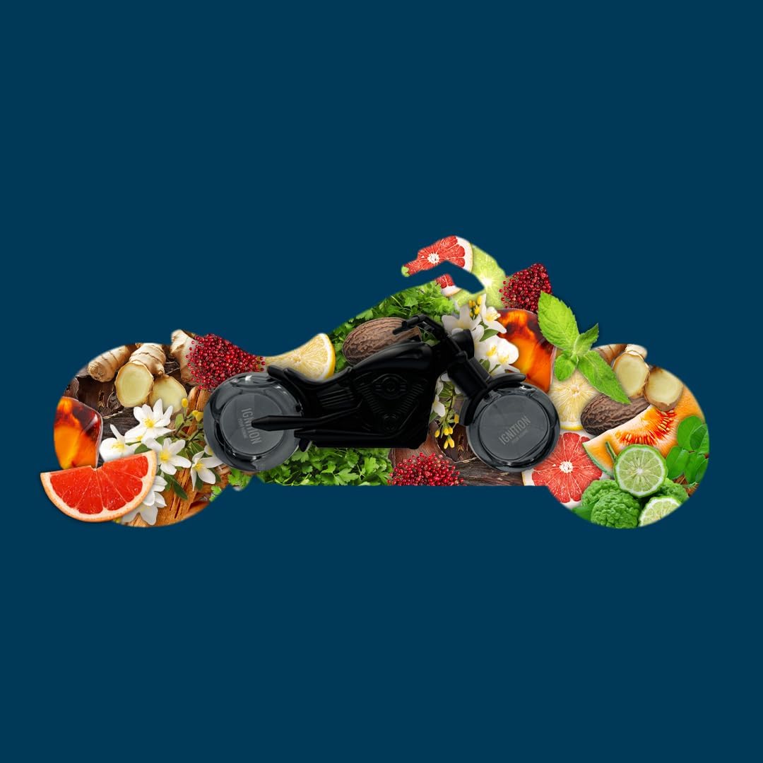 EXCLUSIVE MOTORBIKE DESIGN: Housed in a bold, collectible bottle shaped like a black motorbike—complete with front and back wheel compartments—this set makes a statement on any shelf