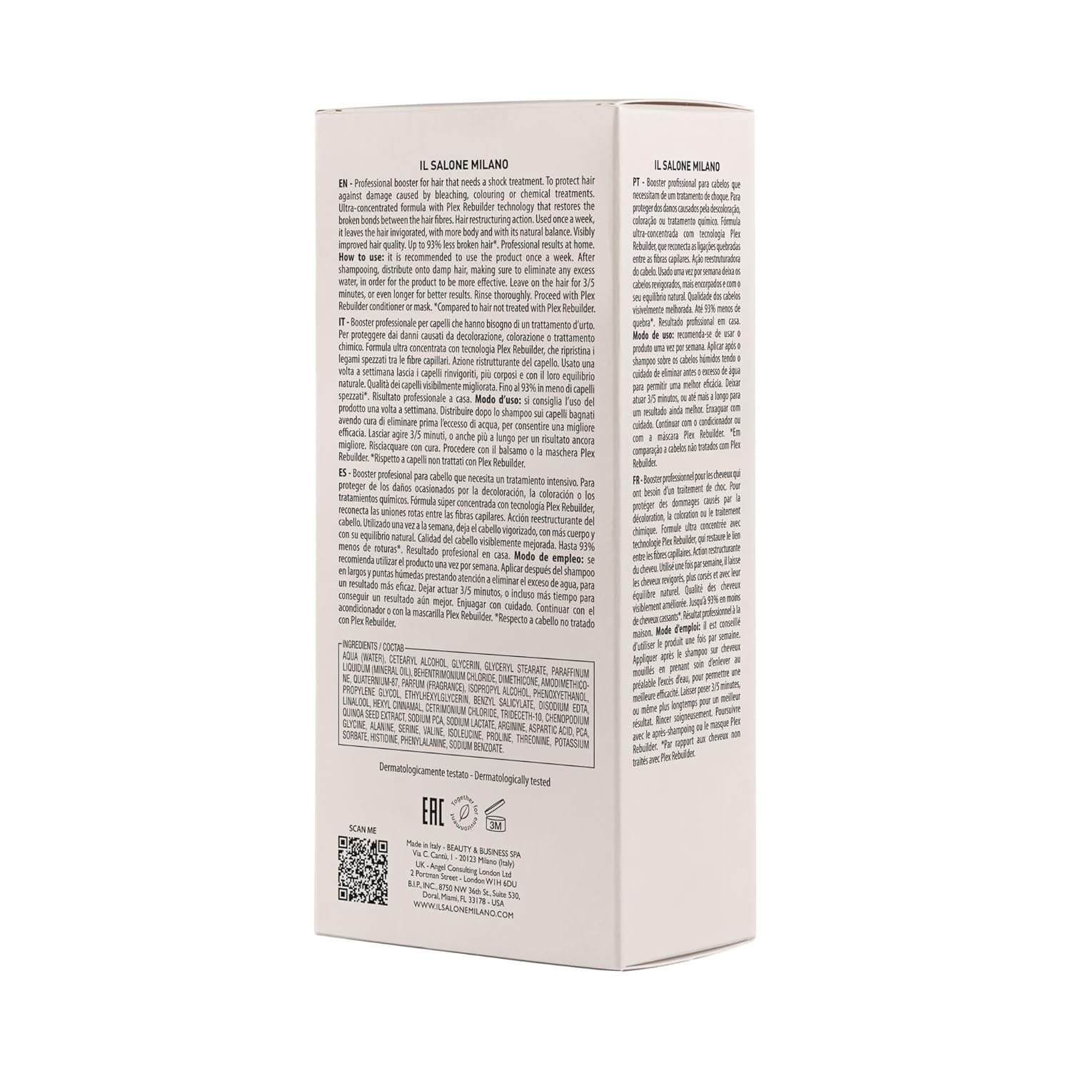 Il Salone Milano Plex Rebuilder Booster is for hair that needs a shock treatment. This professional treatment is formulated to restore the broken bonds between the fibers with its hair restructuring action. Used once a week, it leaves the hair invigorated, with more body and with its natural balance. It protects hair against damage caused by bleaching, coloring, or chemical treatments. The results are less broken hair and visibly improved hair quality. The formula is enriched with Quinoa and a blend of Amino Acids. Quinoa preserves and protects the color. The amino acids deeply hydrate the hair and protect the color. The professional’s choice for beautiful hair at home is the combined use of Il Salone Milano products to maximize results. For bleached, colored, treated hair, use Il Salone Milano Plex Rebuilder Shampoo, Plex Rebuilder Conditioner, Plex Rebuilder Mask, Plex Rebuilder Booster, and Plex Rebuilder Oil. Together they provide the optimal routine for professional results and beautiful hair in the comfort of home. For over 30 years Il Salone Milano is the professional brand chosen by hairdressers. Created for the best Italian hair salons, and soon followed by salons all over the world, Il Salone Milano is driven by quality, tradition, and results. Hairdressers chose these innovative and breakthrough formulas for their customers, now you can experience the same quality and results at home. Il Salone Milano. Your hair salon in a bottle. Made in Italy,Boost, Enhance, and Protect - Il Salone Plex Rebuilder Booster is a bonding hair treatment to restructure strands after damage caused by hair bleach, coloring, and chemical salon services. This repair softener visibly improves texture from the very first application for a healthy appearance,Premium Ingredients - This professional hair bonding treatment is formulated with Plex Rebuilder professional technology - a quinoa infused formula that restores broken bonds between the fibers. Also packed with amino acids to preserve & protect the hair color and deeply hydrate from within,Less Breakage, More Shine - Not only does this unique hair repair treatment restore & restructure broken bonds, but it also provides perfect white coverage. A hair hydration treatment that delivers long lasting color intensity, body, and balance. In a study, 93% of users experienced less breakage compared to those not treated with the Plex Rebuilder booster,How to Use - After shampooing, distribute the Plex Rebuilder hair softener onto damp hair making sure to eliminate any excess water. Leave on for 3-5 minutes & rinse thoroughly. Proceed with the Plex Rebuilder Conditioner or damaged hair repair mask. For best results, use the full Plex Rebuilder collection once a week,The Legendary Collection - Achieve premium, hair color salon quality results from the comfort of your home. With over 30 years of experience, Il Salone offers professional hair products with legendary formulas. Your hair salon in a bottle! Proudly made and formulated in Italy