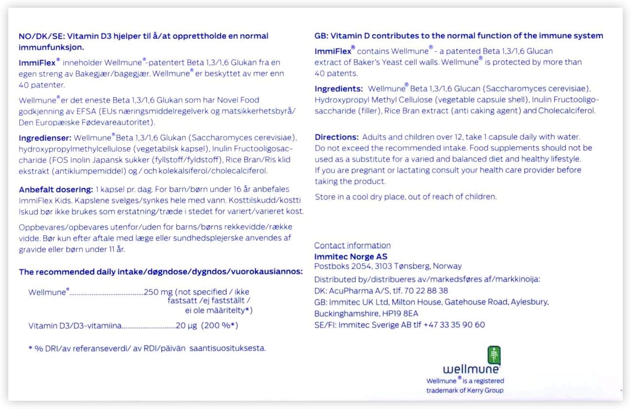 About this item Each Immiflex capsule contains 250mg of Wellmune beta-glucans, Wellmune is a natural beta 1,3/1,6 glucan highly purified from the cell wall of a proprietary bakers yeast (Saccharomcyes cerevisiae) Each Immiflex capsule contains 250mg of Wellmune beta-glucans, Wellmune is a natural beta 1,3/1,6 glucan highly purified from the cell wall of a proprietary bakers yeast (Saccharomcyes cerevisiae) Wellmune is a highly researched beta-glucan, supported by over a dozen clinical trials and approved as a novel food in Europe The beta-glucans in Immiflex have been complemented with 25?g of vitamin D3 to support the immune system Immiflex contains only natural ingredients and is also non-allergenic, Kosher, Halal, non-GMO and suitable for vegetarians Immiflex is recommended for daily, lifelong consumption to support you and your families healthy and active lifestyle › See more product details,Each Immiflex capsule contains 250mg of Wellmune beta-glucans, Wellmune is a natural beta 1,3/1,6 glucan highly purified from the cell wall of a proprietary bakers yeast (Saccharomcyes cerevisiae),Each Immiflex capsule contains 250mg of Wellmune beta-glucans, Wellmune is a natural beta 1,3/1,6 glucan highly purified from the cell wall of a proprietary bakers yeast (Saccharomcyes cerevisiae),Wellmune is a highly researched beta-glucan, supported by over a dozen clinical trials and approved as a novel food in Europe,The beta-glucans in Immiflex have been complemented with 25?g of vitamin D3 to support the immune system,Immiflex contains only natural ingredients and is also non-allergenic, Kosher, Halal, non-GMO and suitable for vegetarians,Immiflex is recommended for daily, lifelong consumption to support you and your families healthy and active lifestyle