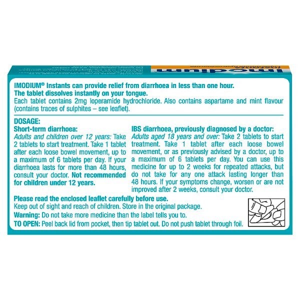 Product Information:These fast dissolving tablets are used to treat sudden attacks of diarrhoea, by making the stools more solid and less frequent,Benefit:Imodium helps the body to absorb more water and nutrients, leading to a better functioning small intestine and better bowel movement. These tablets will help put you back in control of your life and free to get on with your regular daily activates. Imodium Instants melt in your mouth, so no need to take with water. Great for people on the move,Warning or Restrictions:12 Years (Advisory),Product Specification:Each Tablet Contains 2Mg Loperamide Hydrochloride And Also Contains Aspartame,See Leaflet For Further Information,Product Uses:DOSAGE: Sudden short-lived (acute) diarrhoea. Adults and children over 12 years: Take 2 tablets initially, followed if required, by 1 tablet after every further loose bowel movement, up to a maximum of 6 tablets per day. If your diarrhoea lasts for more than 24 hours, consult your doctor. Not recommended for children under 12 years. Diarrhoea associated with Irritable bowel syndrome (IBS) already diagnosed by a doctor: Adults aged 18 years and over: Take 2 tablets initially, followed if required, by 1 tablet after every further loose bowel movement, or as advised previously by your doctor. Do not take more than 6 tablets per day. If your symptoms change or if your diarrhoea persists for more than 2 weeks, consult your doctor. Please read the enclosed leaflet carefully before use. Warning: Do not exceed the stated dose