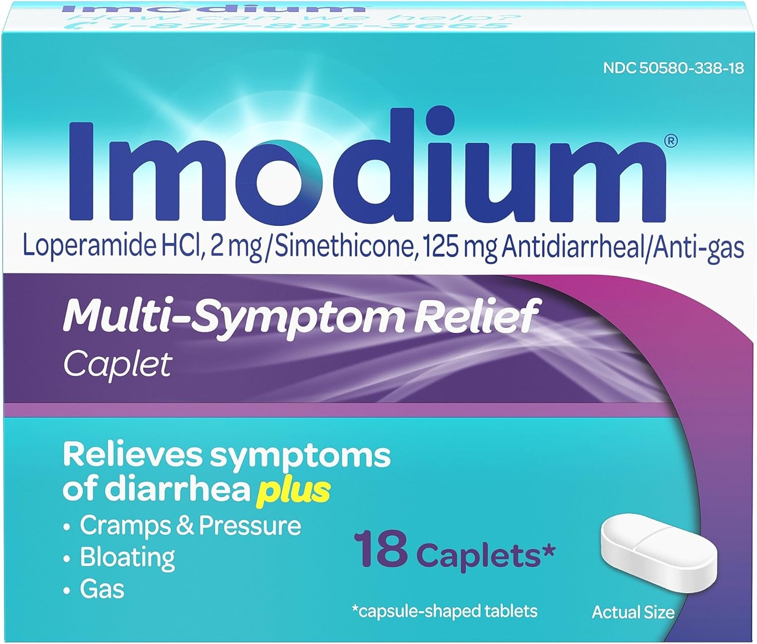 About this item 18-count package of Imodium Multi-Symptom Relief Caplets with loperamide HCl and simethicone for effective relief of diarrhea and other abdominal-related symptoms Imodium Multi-Symptom Relief is the only branded product that provides diarrhea relief while also helping to alleviate abdominal symptoms by working with your body to slow down your system and restore its natural rhythm and balance Each caplet of diarrhea medicine contains 2 mg of loperamide hydrochloride for acute diarrhea relief and 125 mg of simethicone to help treat symptoms associated with gas-related abdominal discomfort including bloating, pressure, gas and cramps No other branded anti-diarrheal medicine combines the two powerful ingredients of loperamide HCl and simethicone for multi-symptom relief From #1 doctor-recommended brand of anti-diarrheals, these medicine caplets are suitable for use by adults and children ages 12 and older for effective diarrhea relief, both at home and on-the-go See more product details,18-count package of Imodium Multi-Symptom Relief Caplets with loperamide HCl and simethicone for effective relief of diarrhea and other abdominal-related symptoms,Imodium Multi-Symptom Relief is the only branded product that provides diarrhea relief while also helping to alleviate abdominal symptoms by working with your body to slow down your system and restore its natural rhythm and balance,Each caplet of diarrhea medicine contains 2 mg of loperamide hydrochloride for acute diarrhea relief and 125 mg of simethicone to help treat symptoms associated with gas-related abdominal discomfort including bloating, pressure, gas and cramps,No other branded anti-diarrheal medicine combines the two powerful ingredients of loperamide HCl and simethicone for multi-symptom relief,From #1 doctor-recommended brand of anti-diarrheals, these medicine caplets are suitable for use by adults and children ages 12 and older for effective diarrhea relief, both at home and on-the-go