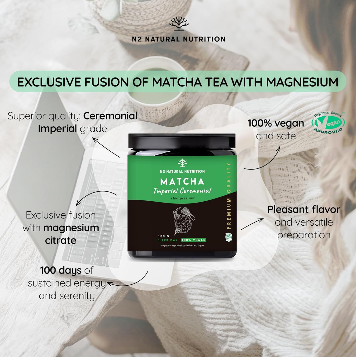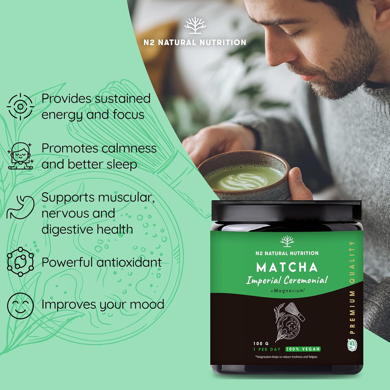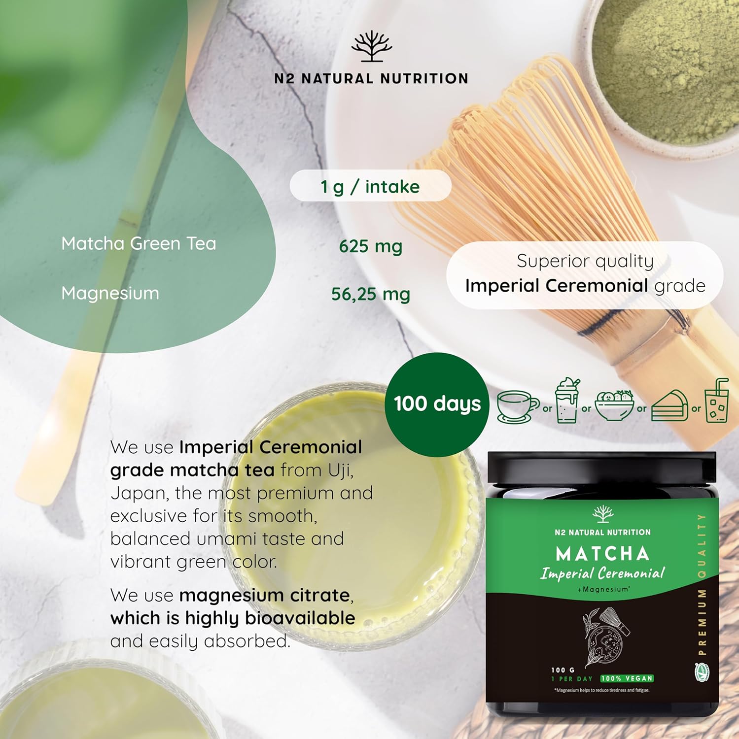 Imperial Ceremonial Grade Matcha Tea Powder + Magnesium Citrate, 100Gr. Sourced From Uji, Japan, High Dose, Vegan, Made In Eu, Natural Energy And Focus, Detox Superdrink. N2 Natural Nutrition