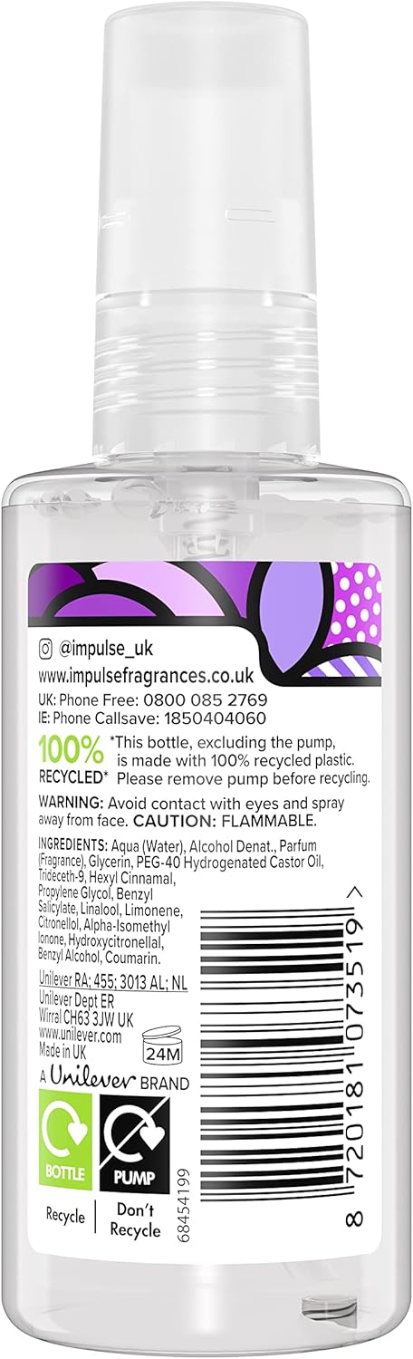 Product Description Discover Impulse Floral Fancy Body Mist in a compact 100 ml size. Travel in time to reignite the memory of summer, flowery scents. Like the cassis and red berries you used to pick in the forest and taste every summer. Wandering the countryside, every place seemed magical with your childlike imagination. Passing by fruit trees, you'd reach wild creeks and ponds where the scents of water lilies, lotus flowers and jasmine mingled to create an unforgettable memory of those summer days. With a sweet vanilla and musk base, Floral Fancy brings it back to life, fresh and vivid. Wear it. Express it. Trust your senses and femininity. Have the confidence to wear the deodorant spray you want and take the first step to becoming who you really want to be. Wake up. Kick ass. Repeat. You’ve got it. You are ready to take on the world with your own unique style. Go out there and trust your Impulse with our Body Mists range. They’re everything you need to be the best version of you, and now contain 100% PCR plastic*. The best woman you can be. With the best body spray. Pop the top, spray the fragrance where you want, when you want. Put the handy 100 ml bottle in your bag, on top of your cupboard, anywhere really. It’s the perfect on-the-go top-up. #TrustYourImpulse *excluding the pump Ingredients Aqua (Water), Alcohol Denat., Parfum (Fragrance), Glycerin, PEG-40 Hydrogenated Castor Oil, Trideceth-9, Hexyl Cinnamal, Propylene Glycol, Benzyl Salicylate, Linalool, Limonene, Citronellol, Alpha-Isomethyl Ionone, Hydroxycitronellal, Benzyl Alcohol, Coumarin. P.when('A').execute(function(A) { A.on('a:expander:toggle_description:toggle:collapse', function(data) { window.scroll(0, data.expander.$expander[0].offsetTop-100); }); }); Directions [INCOMPLETE] Spray the product on the body. See more,Discover the scent-sation of Impulse Floral Fancy Body Mist, made with 100% PCR plastic,Be the best version of you with a refreshing body mist spray with a fresh floral scent,Strut your stuff on a hot summer night with notes of red berries, lotus flower and vanilla encapsulated in a body mist,Pop the top and spray the fragrance impulsively where you want it, when you want it,Perfect for your handbag – take the handy-sized 100 ml deodorant spray bottle with you night and day