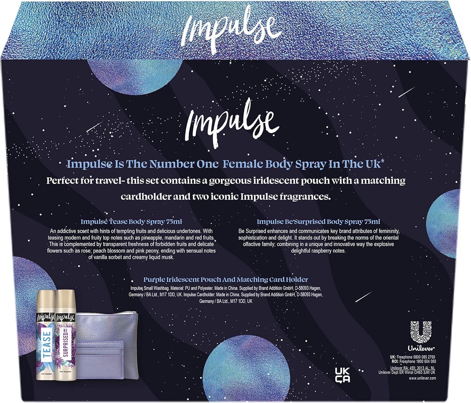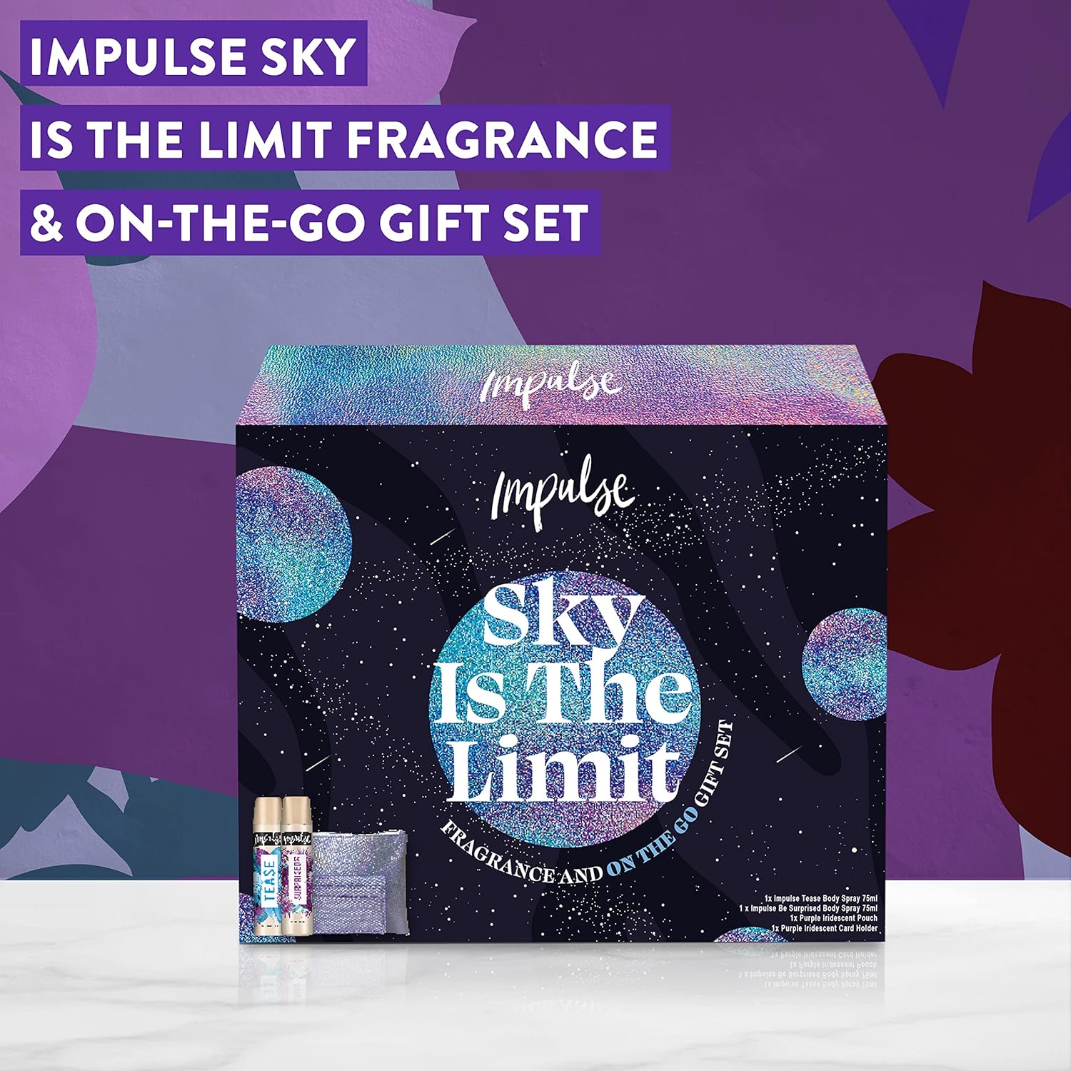 Product Description Looking for unique Christmas gift ideas for someone who is always one step ahead of the game The Impulse Sky Is The Limit Body Spray Fragrance & On-The-Go Christmas Gift Set features two body fragrances for the bold trendsetters who love to style out their mood with the perfect scent – and smell fabulous all the time. Great for travel, this glam set of Christmas gifts for her comes complete with a sophisticated, purple iridescent makeup bag and a matching cardholder – ideal for storing her favourite essentials and staying organised on the go. Impulse Tease Body Spray 75 ml is an addictive fragrance with hints of tempting fruits and delicious woody undertones. The top notes of pineapple, mandarin and red fruits are complemented by delicate flowers such as rose, peach blossom and pink peony, ending with sensual notes of vanilla sorbet and creamy liquid musk. Impulse Be Surprised Body Spray 75 ml enhances and communicates the key attributes of femininity, sophistication and delight with warm and delicate orange flower lifted with fruity citrus top notes. This fabulous gift set for women is packaged in a stunning ready-to-gift box – the perfect stocking filler, Secret Santa, or special Christmas gift. Empower her to confidently trust her Impulse and celebrate being unapologetically herself. With Impulse, she’ll feel like the sky’s the limit. Ingredients IMPULSE BS 75ML TEASE: Alcohol Denat., Butane, Isobutane, Propane, Parfum, Citronellol, Coumarin, Hydroxycitronellal, Limonene, Linalool. IMPULSE BS 75ML BE SURPRISED UK: Alcohol Denat., Butane, Isobutane, Propane, Parfum, Alpha-Isomethyl Ionone, Benzyl Alcohol, Benzyl Salicylate, Geraniol, Limonene, Linalool,Impulse Sky Is The Limit Body Spray Fragrance & On-The-Go Christmas Gift Set includes two full-size body sprays, a gorgeous iridescent makeup bag and a matching cardholder,Impulse Tease Body Spray 75 ml features fruity top notes complemented by delicate flowers and layered with sensual notes of vanilla sorbet and creamy liquid musk,Impulse Be Surprised Body Spray 75 ml stands out by breaking the norms of the oriental olfactive family, combining delicate orange flower with a sensual blend of sweet caramel and warm vanilla,This sensational body spray duo allows her to pick whichever scent she feels like, on an Impulse,Be inspired by gifts for her – this unique gift set is complemented by a fabulous iridescent beauty bag for stashing all her goodies and a matching cardholder to keep her organised,Gift ideas for women with confidence are all wrapped up! This Christmas gift set for her comes packaged in a stunning ready-to-gift box