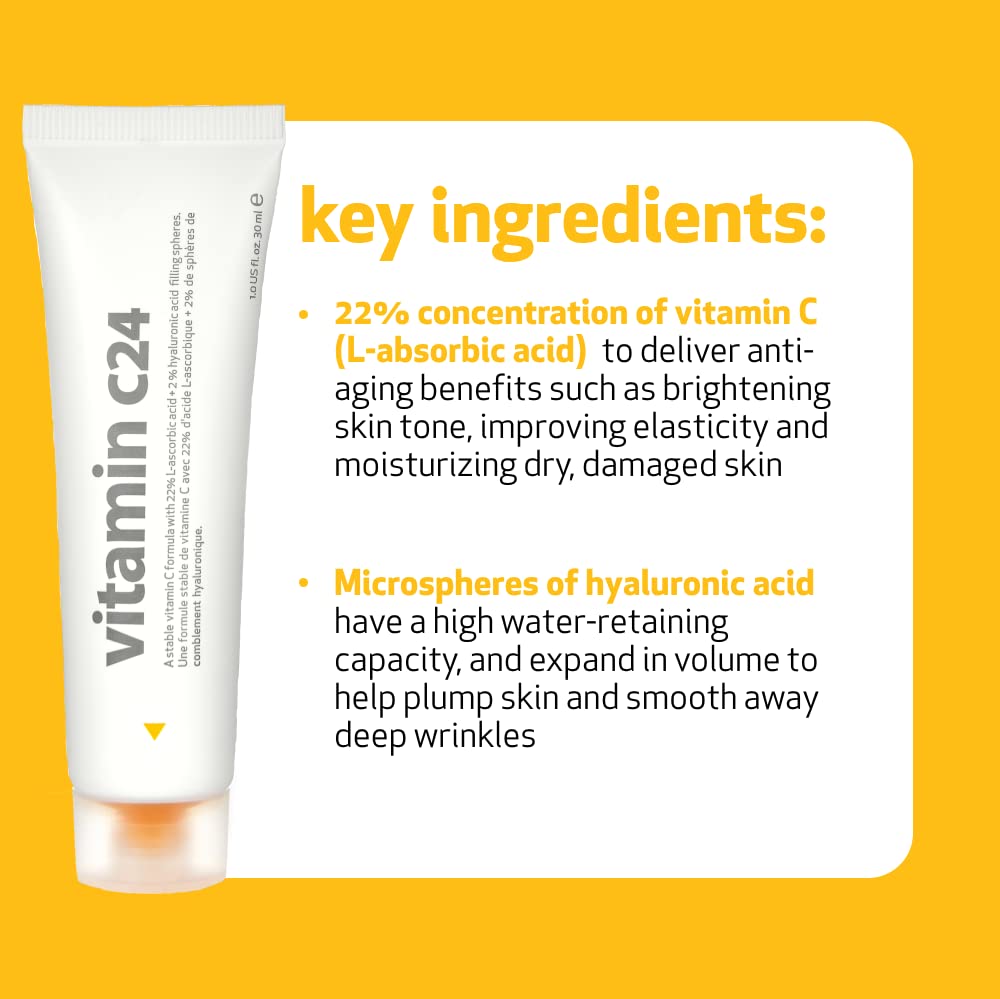 About this item LIGHTWEIGHT FACE SERUM: The Indeed Labs Vitamin C24 Serum is a combined serum and moisturizer formulated with 22% ascorbic acid and 2% hyaluronic microspheres to help protect your skin from environmental damage, while increasing hydration levels to even out skin tone and reduce the look of fine lines and wrinkles VITAMIN C BLEND: Unlike other vitamin C serums, Vitamin C24 has a unique formula that stays stable, doesn't oxidize and is designed to optimize absorption into the skin, allowing for maximum vitamin C benefits and potency FIGHT HYPERPIGMENTATION: This active lightweight moisturizing treatment helps to reduce the appearance of hyperpigmentation and facial discoloration. Lightweight texture is great for layering underneath other products or makeup. Restores skin's youthful, glowing, radiant, and luminous appearance and improves the appearance and feel of skin ANTIOXIDANT BENEFITS: Vitamin C cream can help reduce the appearance of fine lines and wrinkles, helps to protect skin from environmental stressors, and to repair and restore luminosity and radiance to the skin, face, and neck This ANTI-AGING VEGAN SKINCARE PRODUCT contains no phthalates, sulfates, parabens, or mineral oil. It is fragrance-free, alcohol-free and dye-free. Apply a pea-sized amount to a cleansed face and neck in the morning and evening. See more product details,LIGHTWEIGHT FACE SERUM: The Indeed Labs Vitamin C24 Serum is a combined serum and moisturizer formulated with 22% ascorbic acid and 2% hyaluronic microspheres to help protect your skin from environmental damage, while increasing hydration levels to even out skin tone and reduce the look of fine lines and wrinkles,VITAMIN C BLEND: Unlike other vitamin C serums, Vitamin C24 has a unique formula that stays stable, doesn't oxidize and is designed to optimize absorption into the skin, allowing for maximum vitamin C benefits and potency,FIGHT HYPERPIGMENTATION: This active lightweight moisturizing treatment helps to reduce the appearance of hyperpigmentation and facial discoloration. Lightweight texture is great for layering underneath other products or makeup. Restores skin's youthful, glowing, radiant, and luminous appearance and improves the appearance and feel of skin,ANTIOXIDANT BENEFITS: Vitamin C cream can help reduce the appearance of fine lines and wrinkles, helps to protect skin from environmental stressors, and to repair and restore luminosity and radiance to the skin, face, and neck,This ANTI-AGING VEGAN SKINCARE PRODUCT contains no phthalates, sulfates, parabens, or mineral oil. It is fragrance-free, alcohol-free and dye-free. Apply a pea-sized amount to a cleansed face and neck in the morning and evening