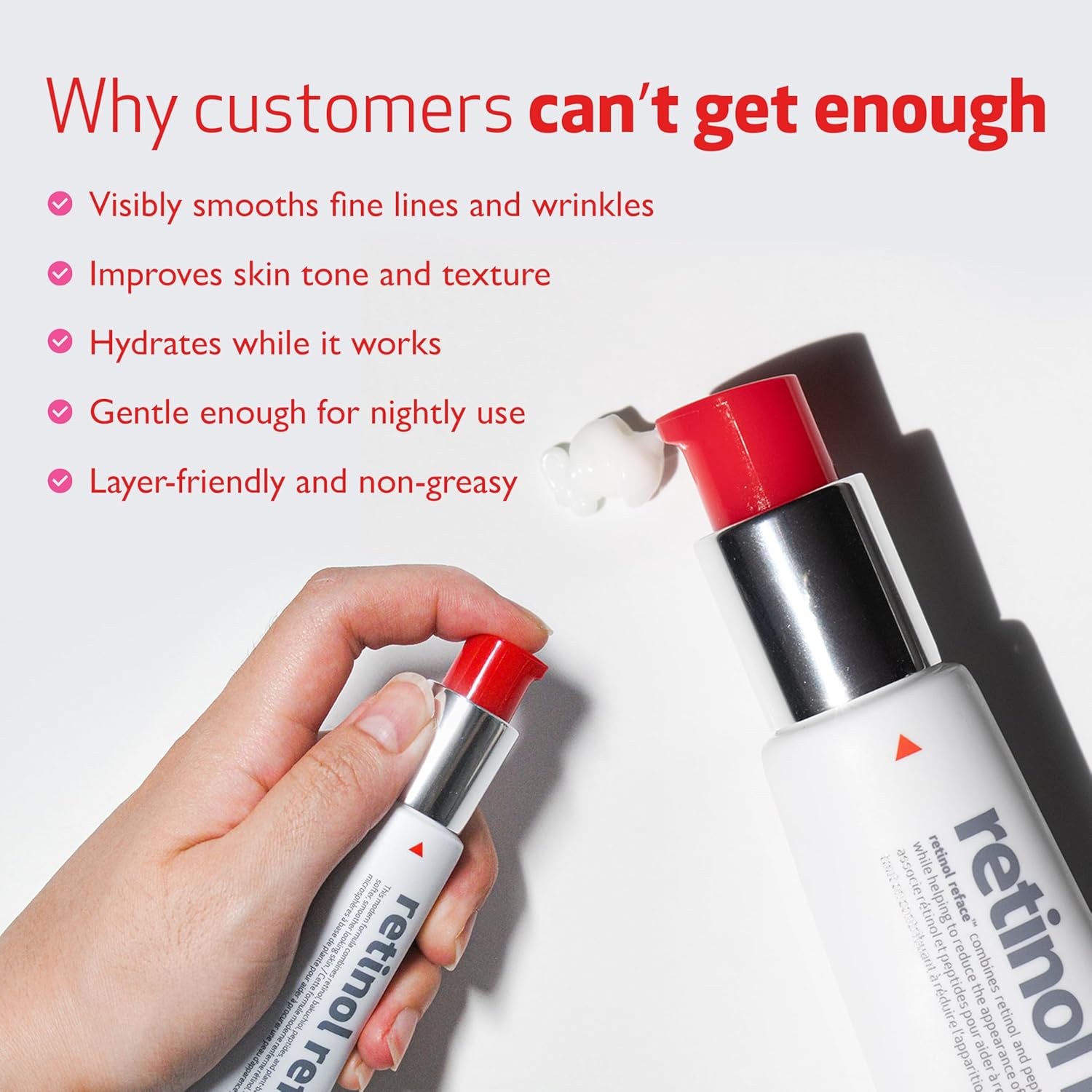 About this item POWERFUL 3-IN-1 RETINOL CREAM - Reveal smoother, more youthful looking skin while you sleep! This retinol face cream delivers a combination of retinol, bakuchiol, and a retinol-like peptide to provide an accelerated resurfacing effect, improving the look of fine lines, wrinkles, textured skin, and uneven tone while minimizing sensitivity. NEW ADVANCED RETINOL FACE FORMULA - This is not your average retinol moisturizer; Retinol Reface is a concentrated blend that effectively targets signs of aging overnight with innovative slow-release Retinol Microspheres to minimize redness and irritation. Free of parabens, phthalates, talc, gluten, and fragrances. RESURFACES & REDUCES SIGNS OF AGING - This retinol moisturizer for face and decolletè improves cell turnover and collagen production while targeting a variety of visible skin issues, including wrinkles, fine lines, acne, dark spots, roughness, and dryness. Safe for sensitive skin, this retinol cream promotes hydration, elasticity, firmness, radiance, and brightness. HOW TO USE - To reduce visible signs of aging, apply 1-2 pumps of this retinol cream evenly over a cleansed face and neck every other night, working up to nightly use. Follow with a broad-spectrum sunscreen each morning. Use retinol moisturizer consistently for visibly softer, smoother skin. ABOUT INDEED LABS - Founded by Businesswoman of the Year Dmitra Davidson, Indeed Labs has been delivering Canada-made clean beauty innovation for over 15 years through science-backed skincare products like this 3-in-1 retinol face formula. See more product details,POWERFUL 3-IN-1 RETINOL CREAM - Reveal smoother, more youthful looking skin while you sleep! This retinol face cream delivers a combination of retinol, bakuchiol, and a retinol-like peptide to provide an accelerated resurfacing effect, improving the look of fine lines, wrinkles, textured skin, and uneven tone while minimizing sensitivity,NEW ADVANCED RETINOL FACE FORMULA - This is not your average retinol moisturizer; Retinol Reface is a concentrated blend that effectively targets signs of aging overnight with innovative slow-release Retinol Microspheres to minimize redness and irritation. Free of parabens, phthalates, talc, gluten, and fragrances,RESURFACES & REDUCES SIGNS OF AGING - This retinol moisturizer for face and decolletè improves cell turnover and collagen production while targeting a variety of visible skin issues, including wrinkles, fine lines, acne, dark spots, roughness, and dryness. Safe for sensitive skin, this retinol cream promotes hydration, elasticity, firmness, radiance, and brightness,HOW TO USE - To reduce visible signs of aging, apply 1-2 pumps of this retinol cream evenly over a cleansed face and neck every other night, working up to nightly use. Follow with a broad-spectrum sunscreen each morning. Use retinol moisturizer consistently for visibly softer, smoother skin,ABOUT INDEED LABS - Founded by Businesswoman of the Year Dmitra Davidson, Indeed Labs has been delivering Canada-made clean beauty innovation for over 15 years through science-backed skincare products like this 3-in-1 retinol face formula