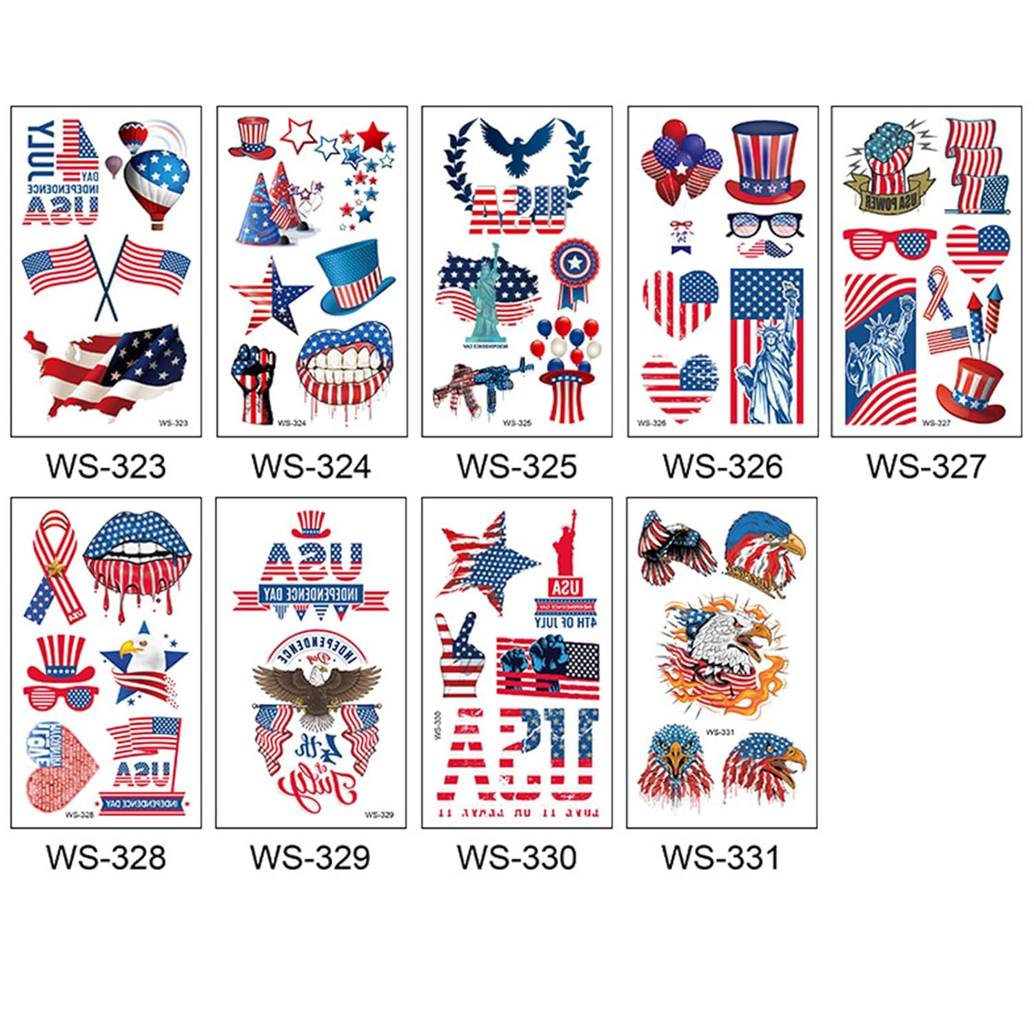 Memorial Day,Independence Day Decorations Tattoos will be a fun addition to any Memorial Day,Independence Day ! decorating for your costume in special holidays . How to use: Cut out the design and remove the transparent paper cover Place temporary tattoo face down on your skin Soak a sponge with regular water and wet the surface of the tattoo thoroughly and wait 20-30seconds Gently lift corner of temporary tattoo to check if it is transferring. If it has transferred, gently peel off paper. If not, press down and wet again Remove the paper and enjoy the beauty of your temporary tattoo How long do the tattoos last Our Halloween temporary tattoos usually last up to 2 to 7 days depending on the applicable area(1-2 days on fingers; 2-3 days on back of hands and wrists; 2-4 days on neck, chest, shoulders and arms; 3-4 days on waist; 3-4 days on legs; 5-6 days on ankles). How to remove Rub the temporary tattoos scars with alcohol or makeup remover or cold cream or baby oil and then wait 10 seconds. Rub again gently and repeatedly until the tattoo has disappeared or by scrubbing it off with soap and water Notices: Do not touch water in 2 hours after you stick it on your skin; Do not rub the tattoo part while showering; Do not bath too long and hot tub bath might make it lose a bit Warning: Do not apply to sensitive skin. Do not apply if you are allergic to adhesiv