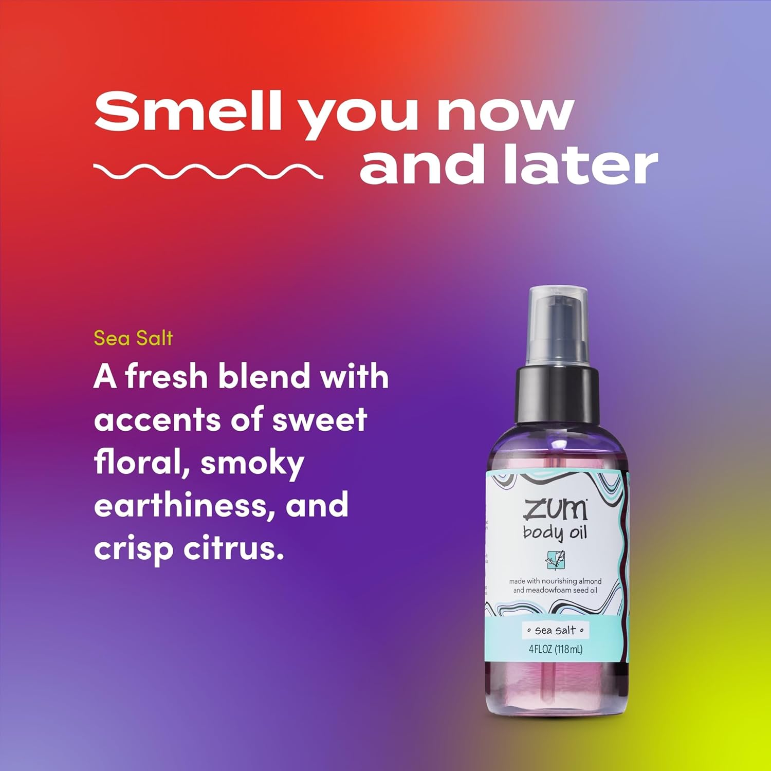 About this item Massaging Oil: Whether you enjoy using this body oil for moisturizing rough, dry skin or you like using it for a soothing massage, you will love the lingering scent Nourishing Massage Body Oil: This Zum product is made with sweet almond oil, shea butter, meadowfoam oil extract, vitamin E and more Crisp Scent Notes: Sea Salt Body Oil has a fresh blend with initial scents of floral, a hint of grapefruit, a touch of geranium and a citrusy, smoky patchouli finish Natural & Cruelty-Free: We use ingredients from nature and don't test our products on animals, making our products vegetarian and cruelty-free About Zum by Indigo Wild: Zum’s natural products for body and home are handcrafted in the U.S.A. with ingredients you can say, spell and love to smell See more product details,Massaging Oil: Whether you enjoy using this body oil for moisturizing rough, dry skin or you like using it for a soothing massage, you will love the lingering scent,Nourishing Massage Body Oil: This Zum product is made with sweet almond oil, shea butter, meadowfoam oil extract, vitamin E and more,Crisp Scent Notes: Sea Salt Body Oil has a fresh blend with initial scents of floral, a hint of grapefruit, a touch of geranium and a citrusy, smoky patchouli finish,Natural & Cruelty-Free: We use ingredients from nature and don't test our products on animals, making our products vegetarian and cruelty-free,About Zum by Indigo Wild: Zum’s natural products for body and home are handcrafted in the U.S.A. with ingredients you can say, spell and love to smell