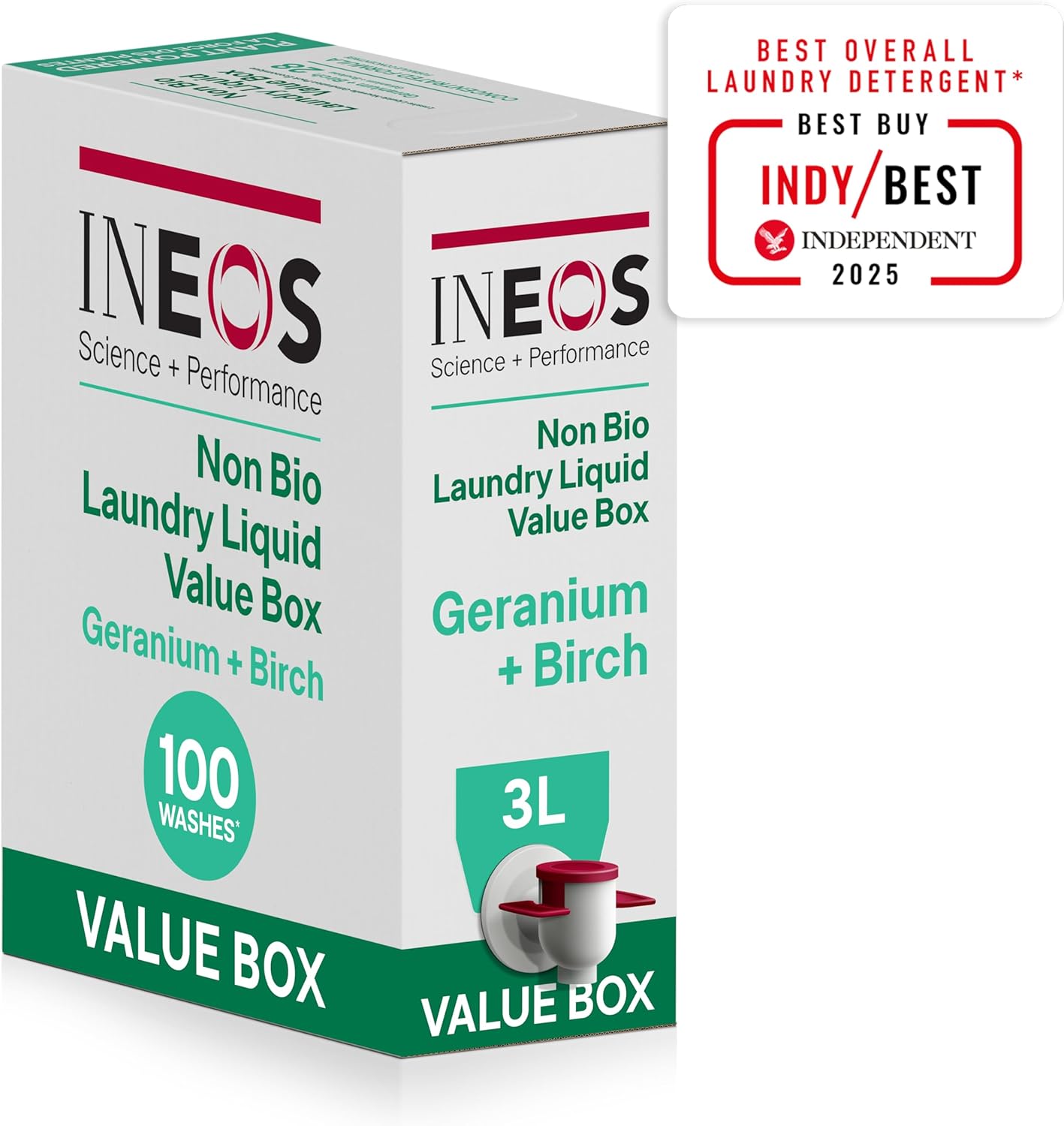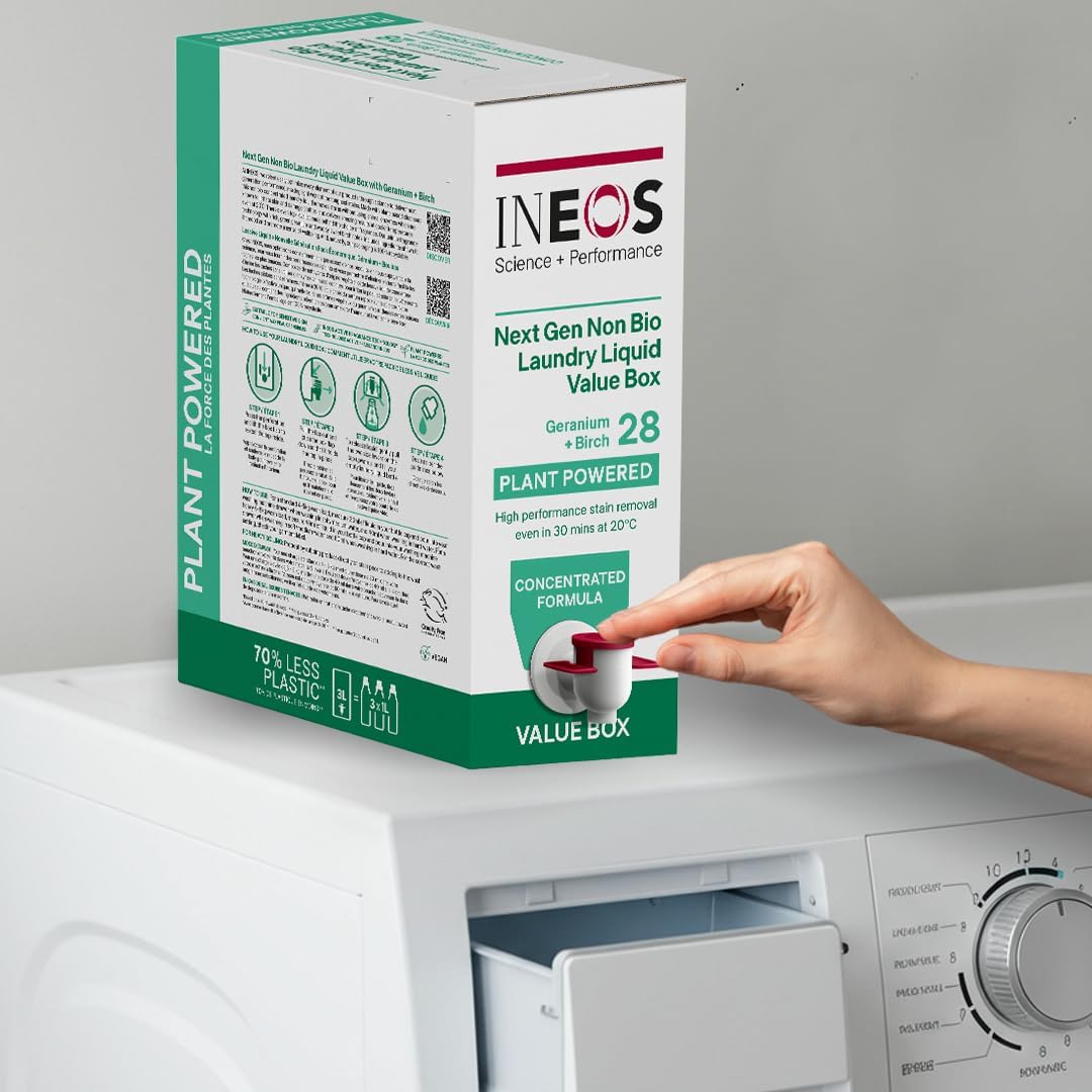 Ineos Next Gen Non Bio Laundry Washing Liquid Detergent, Stain Removal For Clothes, Plant Powered, Eco Value Box Geranium + Birch 3L, Stress Relieving Fragrance, Vegan, Cruelty Free