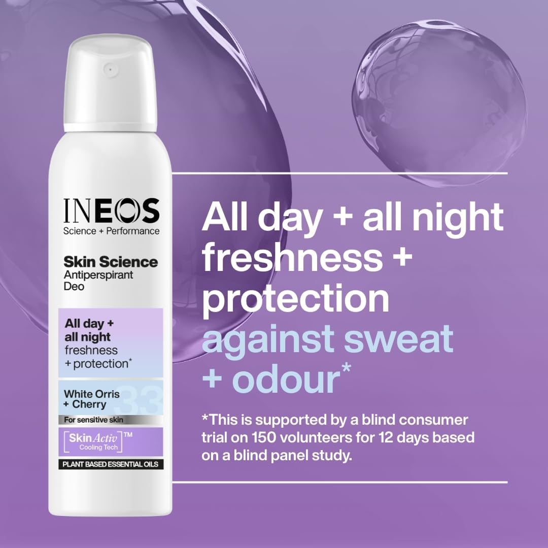 About this item SKIN SCIENCE: At INEOS, we relentlessly optimise our products using the latest in skin science. Our Aerosol Antiperspirant Deodorant contains SkinActiv Cooling Tech, a plant-powered fusion that combats odour + sweat for all day + night freshness. PLANT BASED ESSENTIAL OILS: Our aerosol formulas, enriched with plant-based essential oils, provide effective care, offering a fresher approach to personal careāfeel the difference with Skin Science. INEOS ACTIVE FRAGRANCE TECHNOLOGY: There's even top-level science behind the choice of fragrance. Our White Orris + Cherry fragrance is a rejuvenating fragrance which has ingredients known to give a new lease of life and promote a sense of wellbeing. HOW TO STAY FRESH: Shake the aerosol can before use, then hold it 15cm away from your underarm and spray evenly in a well-ventilated area. FESTIVAL, HOLIDAY AND TRAVEL ESSENTIALS: Our antiperspirant aerosol deodorant ensures odour and sweat control, keeping you protected and refreshed wherever your adventures take you. For external use only. Avoid applying on broken or freshly shaven skin. Avoid contact with eyes. Keep away from naked flame or direct heat sources. āŗ See more product details,SKIN SCIENCE: At INEOS, we relentlessly optimise our products using the latest in skin science. Our Aerosol Antiperspirant Deodorant contains SkinActiv Cooling Tech, a plant-powered fusion that combats odour + sweat for all day + night freshness,PLANT BASED ESSENTIAL OILS: Our aerosol formulas, enriched with plant-based essential oils, provide effective care, offering a fresher approach to personal careāfeel the difference with Skin Science,INEOS ACTIVE FRAGRANCE TECHNOLOGY: There's even top-level science behind the choice of fragrance. Our White Orris + Cherry fragrance is a rejuvenating fragrance which has ingredients known to give a new lease of life and promote a sense of wellbeing,HOW TO STAY FRESH: Shake the aerosol can before use, then hold it 15cm away from your underarm and spray evenly in a well-ventilated area,FESTIVAL, HOLIDAY AND TRAVEL ESSENTIALS: Our antiperspirant aerosol deodorant ensures odour and sweat control, keeping you protected and refreshed wherever your adventures take you,For external use only. Avoid applying on broken or freshly shaven skin. Avoid contact with eyes. Keep away from naked flame or direct heat sources