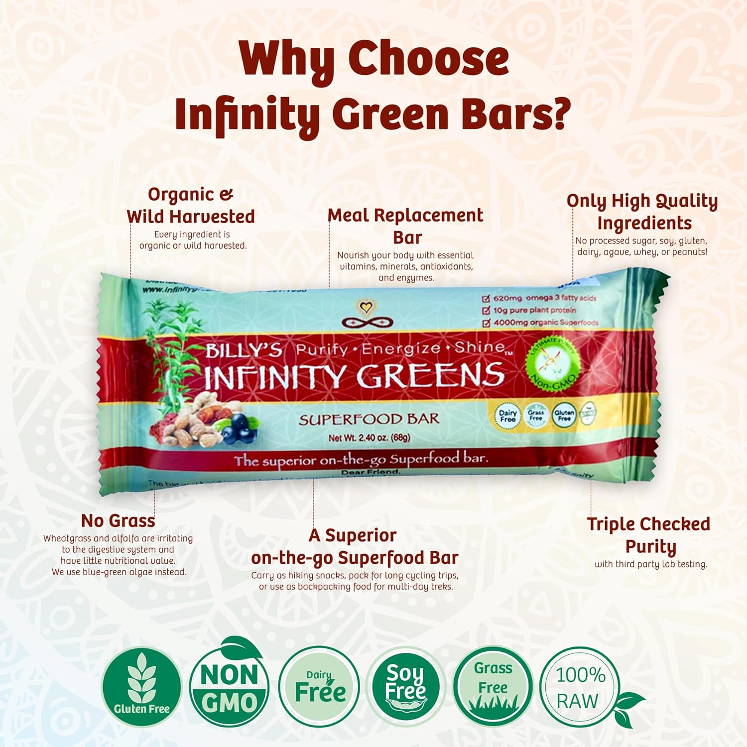 DESCRIPTION : Infinity Greens Superfood Bars | Plant Based Meal Replacement Bars with 4000mg Infinity Greens Superfood Powder | Organic, Raw, Gluten Free, Non GMO | Health Bars (12 Bars)
