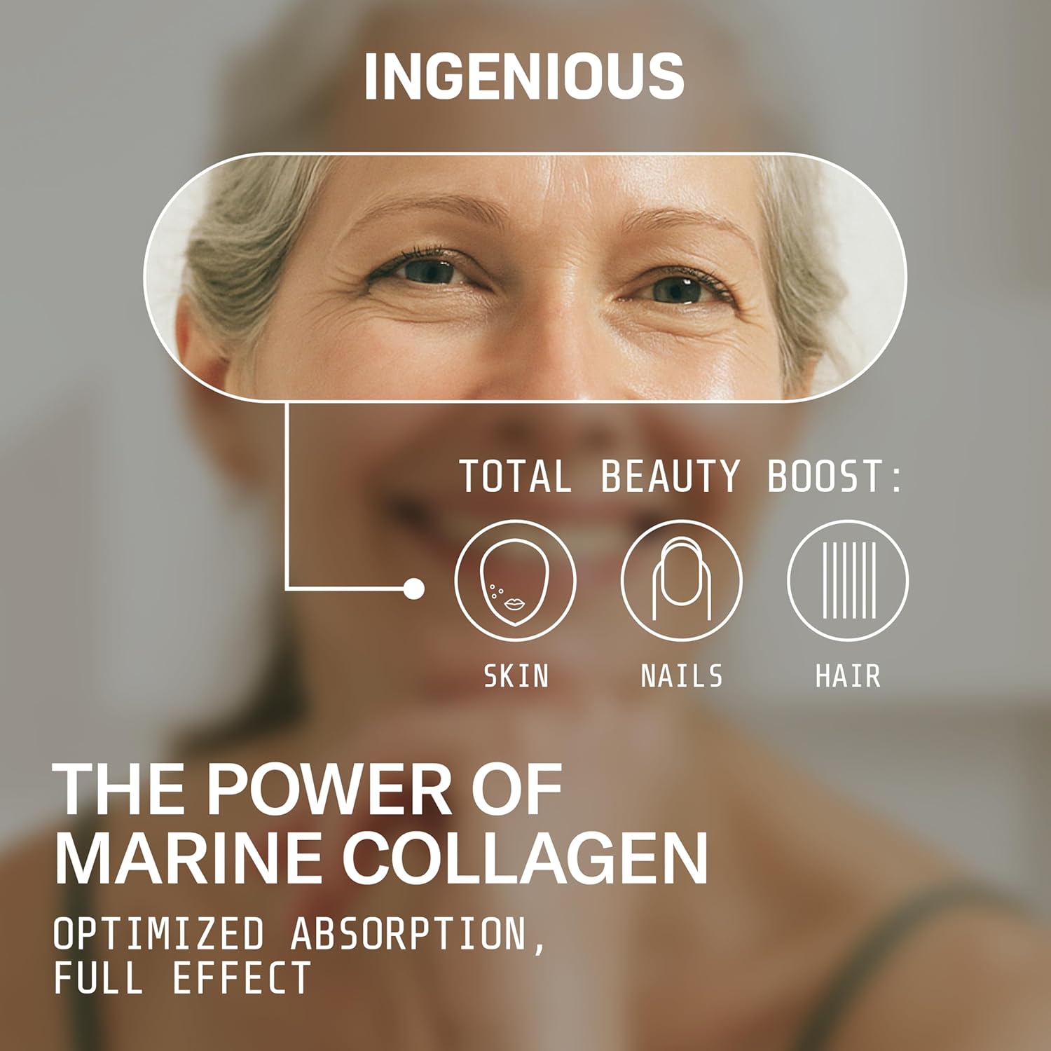 Ingenious Beauty Marine Collagen Capsules Clinically Proven – Hydrolysed Collagen Peptides Hyaluronic Acid Supplement - Reduce Fine Lines & Wrinkles – Natural Astaxanthin - 15 Day Supply
