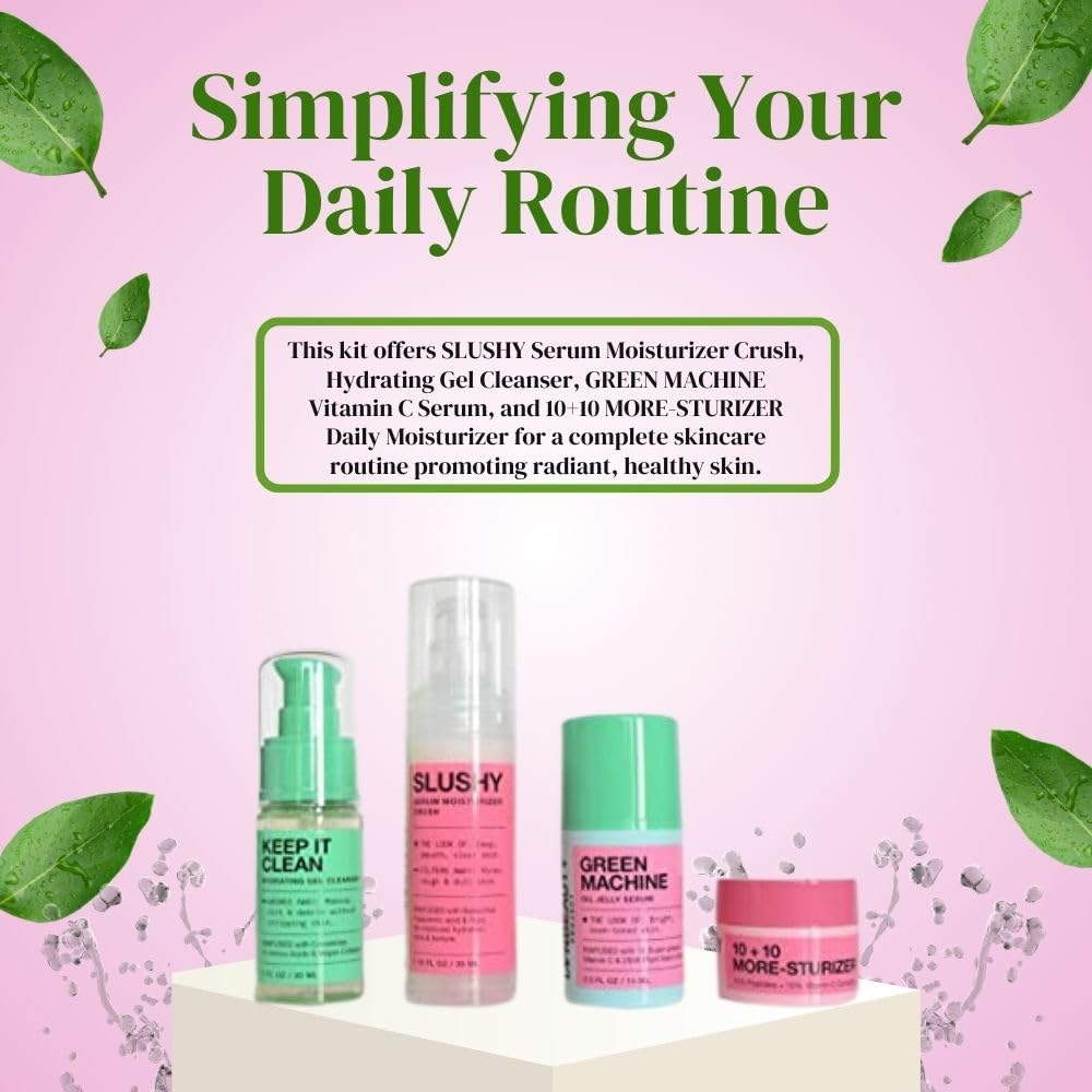 SIMPLE ROUTINE: With SLUSHY Serum Moisturizer Crush, Hydrating Gel Cleanser, GREEN MACHINE Vitamin C Serum, and 10+10 MORE-STURIZER Daily Moisturizer, this kit offers an efficient and straightforward skincare routine for healthy, bright, and glowing skin