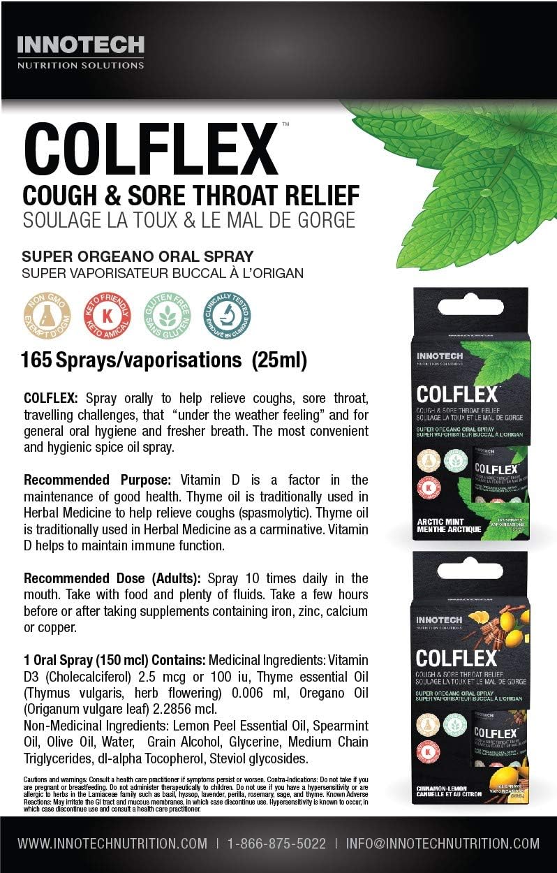 ColFlex Super Oregano Oil Spray is a great-tasting 4-in-1 oral spray containing essential spice oils of oregano, thyme, and spearmint oil in an extra virgin olive oil base, sweetened with stevia and fortified with vitamin D310Thyme oil is traditionally used in Herbal Medicine to help relieve coughs (spasmolytic)10Thyme oil is traditionally used in Herbal Medicine as a carminative10Vitamin D helps to maintain immune function10Innotech Nutrition developed Colflex as a naturopathic alternative to help people avoid taking already overused antibiotics, and the spray is 100 percent all natural. 165 sprays per bottle1010