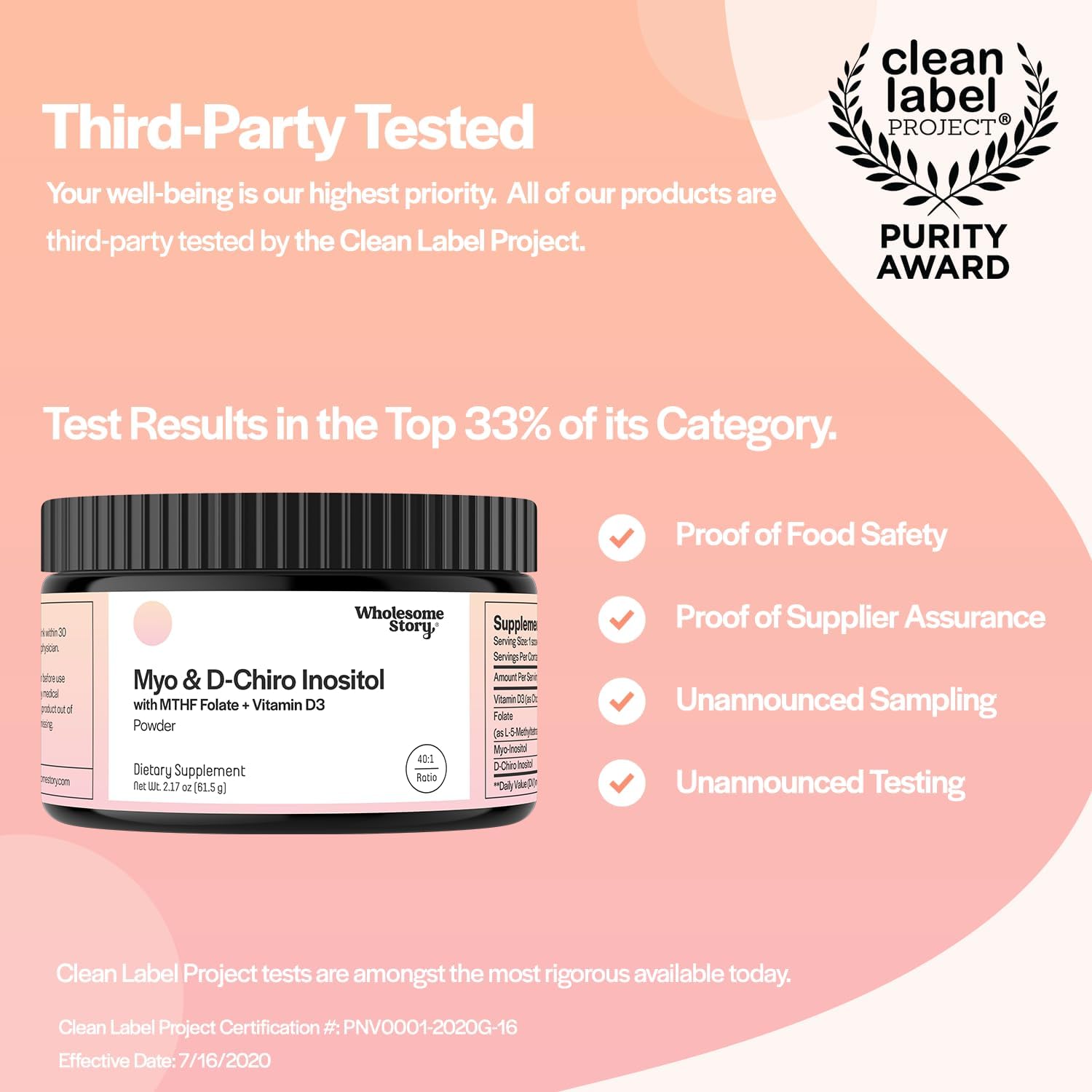 4 >30-Day Supply & Clean Label Project Certified: Our Myo & D-Chiro Inositol Supplement with Methlyfolate and Vitamin D is 100% vegan and cruelty-free. Now available in a convenient, flavorless powder! A great alternative to inositol tablets & capsules