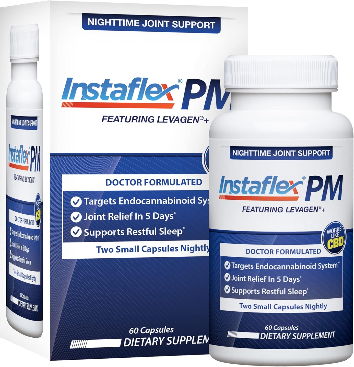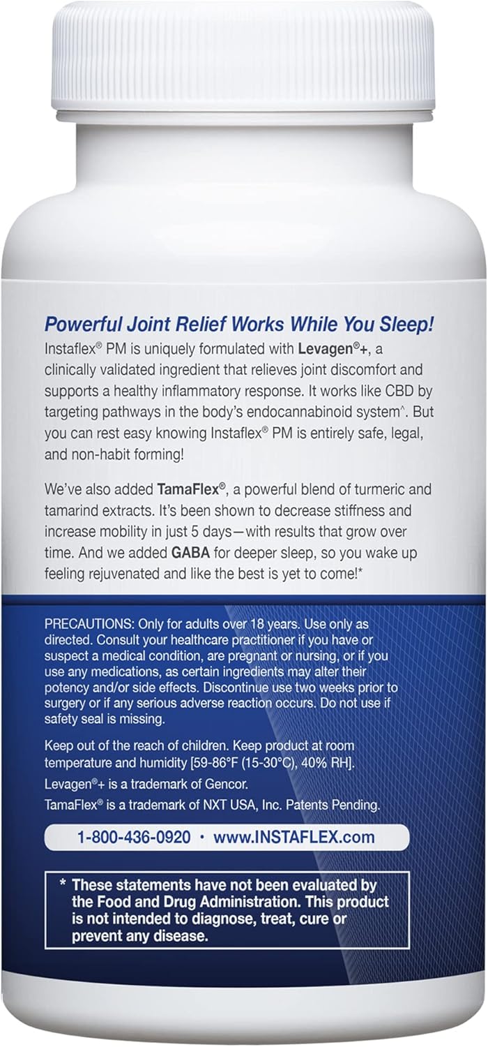 About this item Sore joints keeping you up at night Not anymore! NEW Instaflex PM is the first and only nighttime formula that relieves nagging joint discomfort, increases mobility and flexibility, and enhances sleep quality Levagen safely targets the specific neural pathways responsible for transmitting the feelings of discomfort in order to improve joint function, reduce stiffness, and increase comfort For additional joint support we added Tamaflex, a powerful plant blend clinically validated to improve joint health and mobility in just 2 weeks with results that grow over time! Taken at night, Instaflex PM also contains GABA, Ashwagandha, and Passionflower to help you relax, get deep, uninterrupted sleep, and wake up refreshed and restored. Instaflex PM is doctor-formulated using key ingredients backed by significant scientific evidence for the superior quality and superior results you deserve See more product details,Sore joints keeping you up at night Not anymore! NEW Instaflex PM is the first and only nighttime formula that relieves nagging joint discomfort, increases mobility and flexibility, and enhances sleep quality,Levagen safely targets the specific neural pathways responsible for transmitting the feelings of discomfort in order to improve joint function, reduce stiffness, and increase comfort,For additional joint support we added Tamaflex, a powerful plant blend clinically validated to improve joint health and mobility in just 2 weeks with results that grow over time!,Taken at night, Instaflex PM also contains GABA, Ashwagandha, and Passionflower to help you relax, get deep, uninterrupted sleep, and wake up refreshed and restored,Instaflex PM is doctor-formulated using key ingredients backed by significant scientific evidence for the superior quality and superior results you deserve