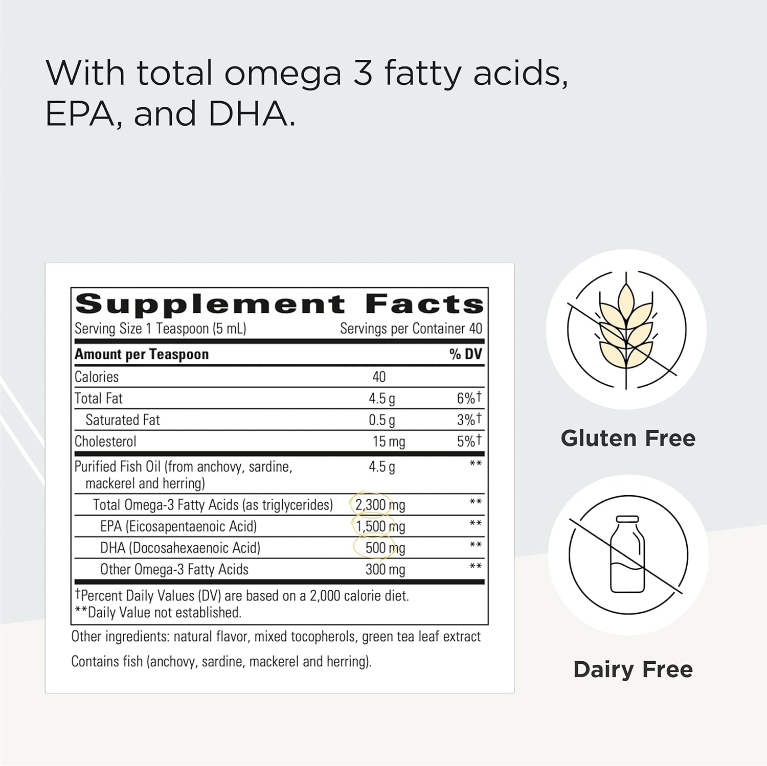 About this item Fish Oil Supplement for Adults: This 2,300 mg omega-3 fish oil supplement contains 1,500 mg EPA, 500 mg DHA, and 300 mg other omegas Delicious Supplement without Fishy Burps: This omega-3 fish oil supplement is lemon flavored so you can enjoy your supplement; it doesn’t have a fishy burp back Omega-3 Fatty Acid Supplement: This supplement utilizes molecular distillation and is third party tested for purity and potency, with the results of these tests available directly to you Fish Oil Supplement: This supplement uses our proprietary green tea preservation system to support against oxidation Your journey to wellness is easier to navigate with a trusted partner by your side; to find the right products for you, we recommend joining forces with your healthcare provider See more product details,Fish Oil Supplement for Adults: This 2,300 mg omega-3 fish oil supplement contains 1,500 mg EPA, 500 mg DHA, and 300 mg other omegas,Delicious Supplement without Fishy Burps: This omega-3 fish oil supplement is lemon flavored so you can enjoy your supplement; it doesn’t have a fishy burp back,Omega-3 Fatty Acid Supplement: This supplement utilizes molecular distillation and is third party tested for purity and potency, with the results of these tests available directly to you,Fish Oil Supplement: This supplement uses our proprietary green tea preservation system to support against oxidation,Your journey to wellness is easier to navigate with a trusted partner by your side; to find the right products for you, we recommend joining forces with your healthcare provider