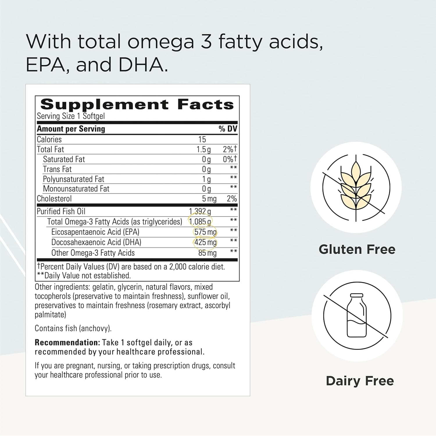 Daily Fish Oil Supplement: This DHA and EPA supplement contains no artificial flavoring, dairy, gluten, salt, or wheat