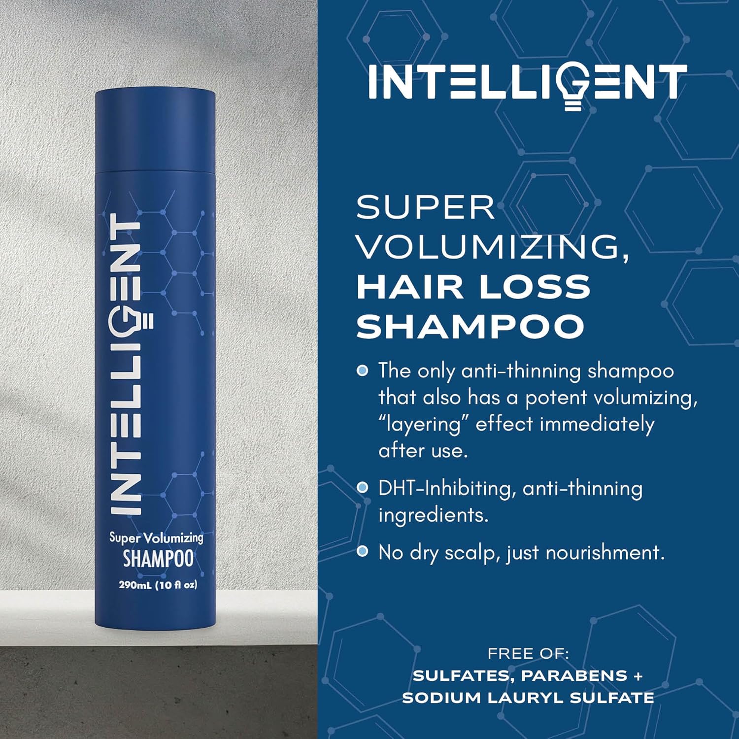 About this item DHT INHIBITING, ANTI-THINNING INGREDIENTS: Intelligent shampoo includes a combination of potent and synergistic ingredients shown to attenuate DHT-mediated hair follicle miniaturization. This addresses the root cause of balding and is not just a cosmetic quick-fix. MAXIMIZE THICKNESS AND VOLUME: This is the only anti-thinning shampoo that also provides a potent volumizing effect. This cutting-edge cleanser is specifically formulated to enhance hair density and complement hair loss treatments. The immediate layering effect maximizes hair thickness and gives your hair a robust, healthy look right after the first use. FOR MEN AND WOMEN | ACHIEVE A FULLER, HEALTHIER LOOK: Intelligent Super Volumizing Shampoo not only attenuates hair follicle miniaturization but also provides an immediate layering effect, giving your hair a thicker, more voluminous appearance. Contains no sulfates, sodium lauryl sulfate, parabens, artificial dyes, and artificial colors, it's perfect for those looking for a natural, fuller look. NO DRY SCALP, JUST FULL-BODIED HAIR: Unlike many harsh hair regrowth shampoos, our Intelligent Super Volumizing Shampoo is gentle on your scalp, preventing dryness, while promoting hair thickness. The synergistic volumizing ingredients ensure your hair remains healthy, manageable, and full-bodied without the discomfort of a dry scalp. PAIR WITH OUR CONDITIONER FOR MAXIMUM VOLUME AND HYDRATION: For best results, use 3-4 times per week and pair with our Intelligent Super Volumizing Conditioner. Designed to complement our shampoo, the conditioner provides additional volume and hydration, ensuring your hair looks and feels its best. Together, they deliver unparalleled thickness, shine, and manageability for a confident, robust appearance. Apply the shampoo to wet hair and scalp with a gentle massage, leave in for 3-5 minutes, and rinse for optimal results. See more product details,DHT INHIBITING, ANTI-THINNING INGREDIENTS: Intelligent shampoo includes a combination of potent and synergistic ingredients shown to attenuate DHT-mediated hair follicle miniaturization. This addresses the root cause of balding and is not just a cosmetic quick-fix,MAXIMIZE THICKNESS AND VOLUME: This is the only anti-thinning shampoo that also provides a potent volumizing effect. This cutting-edge cleanser is specifically formulated to enhance hair density and complement hair loss treatments. The immediate layering effect maximizes hair thickness and gives your hair a robust, healthy look right after the first use,FOR MEN AND WOMEN | ACHIEVE A FULLER, HEALTHIER LOOK: Intelligent Super Volumizing Shampoo not only attenuates hair follicle miniaturization but also provides an immediate layering effect, giving your hair a thicker, more voluminous appearance. Contains no sulfates, sodium lauryl sulfate, parabens, artificial dyes, and artificial colors, it's perfect for those looking for a natural, fuller look,NO DRY SCALP, JUST FULL-BODIED HAIR: Unlike many harsh hair regrowth shampoos, our Intelligent Super Volumizing Shampoo is gentle on your scalp, preventing dryness, while promoting hair thickness. The synergistic volumizing ingredients ensure your hair remains healthy, manageable, and full-bodied without the discomfort of a dry scalp,PAIR WITH OUR CONDITIONER FOR MAXIMUM VOLUME AND HYDRATION: For best results, use 3-4 times per week and pair with our Intelligent Super Volumizing Conditioner. Designed to complement our shampoo, the conditioner provides additional volume and hydration, ensuring your hair looks and feels its best. Together, they deliver unparalleled thickness, shine, and manageability for a confident, robust appearance. Apply the shampoo to wet hair and scalp with a gentle massage, leave in for 3-5 minutes, and rinse for optimal results