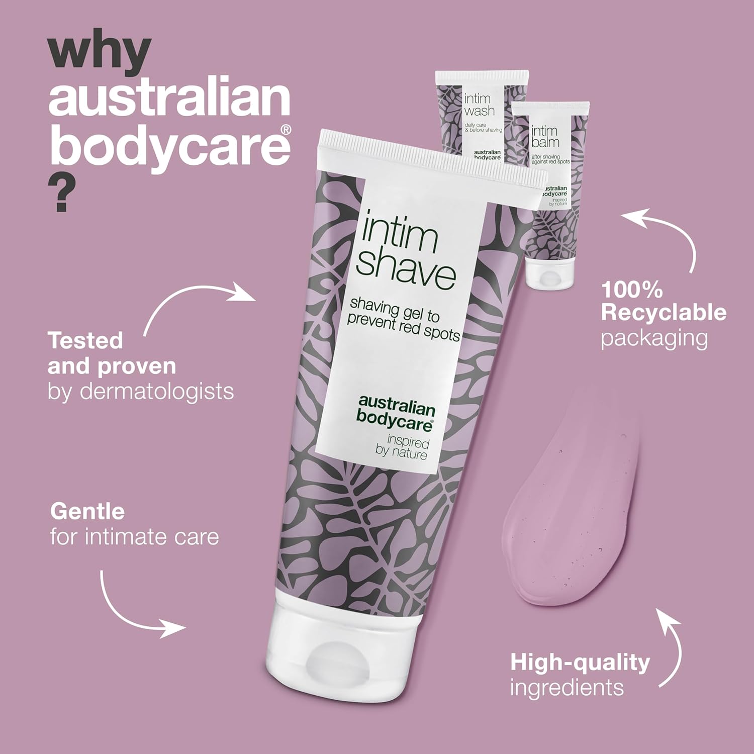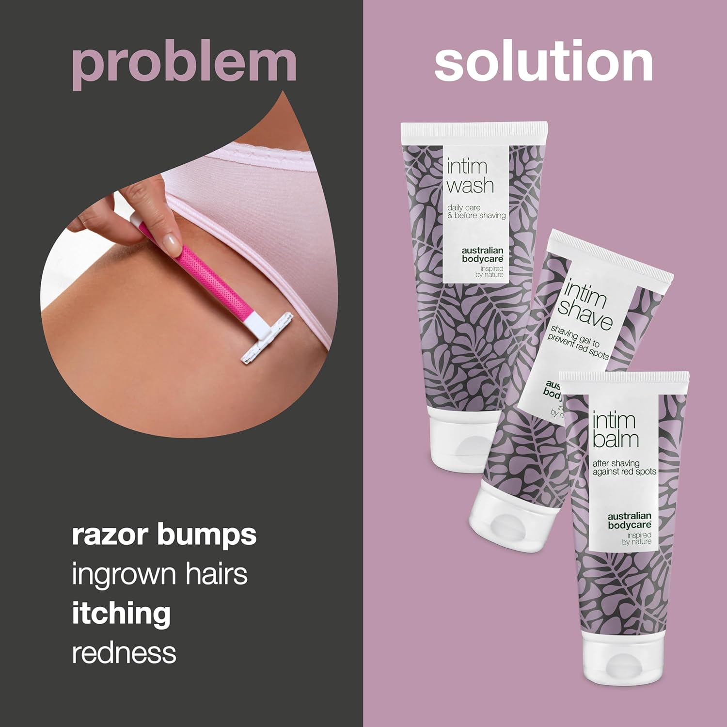 About this item ?? RESULTS: What can I expect and when Use the 3 products for intimate shaving and you will feel the effect immediately and it will be very effective against ingrown hair, razor bumps and razor burns after shaving and waxing. The intimate products are designed for the shaving and waxing of intimate areas and If you haven’t seen any signs of improvement after a week, send us a mail and receive a FULL REFUND! ?? HOW TO USE: How often should I use the products Step 1: Before intimate shaving or waxing, wash the skin with Intim Wash 200ml. Step 2: Then apply Intim Shave 100ml - a transparent shaving gel. Remember: always shave with the hairs using a clean and sharp razor blade. 3: Finally, apply the Australian Bodycare Intim Balm 100ml on to the area after shaving. It’s a leave-on balm, meaning you should not wash your intimate area after application. ?? PRODUCT INFO: Our Intimate shaving products is specially designed to care for the unique pH levels and provide you with everything you need for a perfect shaving or waxing. Our product is 100% vegan and contains natural active ingredients. ?? SUITABILITY: Our intimate products are 100% Vegan and Contains Pharmaceutical Grade natural, Australian Tea Tree Oil. Dermatologically tested by experts. We have been developing problem-solving skin care products of superior quality for more than 30 years. We develop all of our products using top?shelf ingredients. With regards to quality, we do not compromise. Our product is 100% vegan and contains natural active ingredients. › See more product details,?? RESULTS: What can I expect and when Use the 3 products for intimate shaving and you will feel the effect immediately and it will be very effective against ingrown hair, razor bumps and razor burns after shaving and waxing. The intimate products are designed for the shaving and waxing of intimate areas and If you haven’t seen any signs of improvement after a week, send us a mail and receive a FULL REFUND!,?? HOW TO USE: How often should I use the products Step 1: Before intimate shaving or waxing, wash the skin with Intim Wash 200ml. Step 2: Then apply Intim Shave 100ml - a transparent shaving gel. Remember: always shave with the hairs using a clean and sharp razor blade. 3: Finally, apply the Australian Bodycare Intim Balm 100ml on to the area after shaving. It’s a leave-on balm, meaning you should not wash your intimate area after application,?? PRODUCT INFO: Our Intimate shaving products is specially designed to care for the unique pH levels and provide you with everything you need for a perfect shaving or waxing. Our product is 100% vegan and contains natural active ingredients,?? SUITABILITY: Our intimate products are 100% Vegan and Contains Pharmaceutical Grade natural, Australian Tea Tree Oil. Dermatologically tested by experts. We have been developing problem-solving skin care products of superior quality for more than 30 years. We develop all of our products using top?shelf ingredients. With regards to quality, we do not compromise. Our product is 100% vegan and contains natural active ingredients