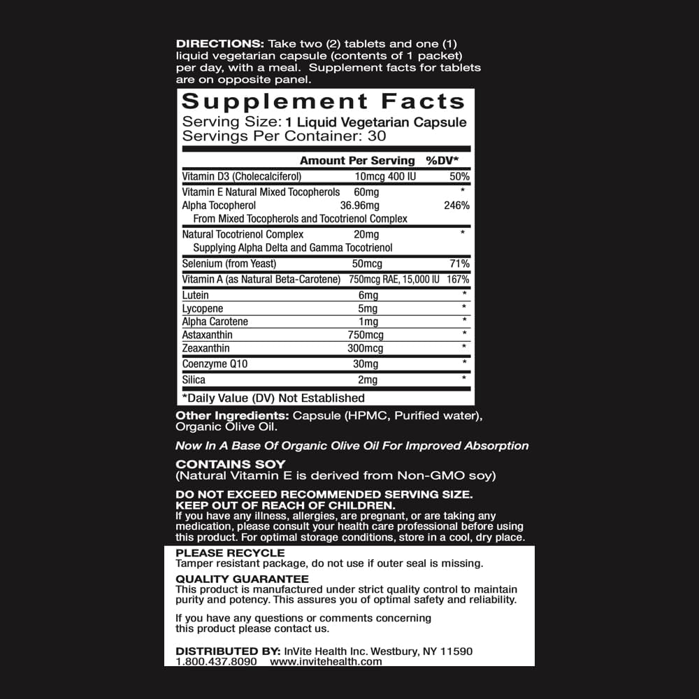 USES: Multivitamin and Multimineral formula with Antioxidants & Phytonutrients10KEY INGREDIENTS: Provides activated B vitamins, Natural Vitamin E, Chelated Minerals, CoQ10 and carotenoid pigments (like Lutein and Lycopene), to support the health of the brain, eyes, immune and circulatory system10FORM: 30 Packets10DIETARY FEATURES: Dairy Free, Gluten Free. CONTAINS SOY10HOW TO TAKE: Two (2) tablets and one (1) liquid capsule (contents of 1 packet) per day, taken with a meal1010