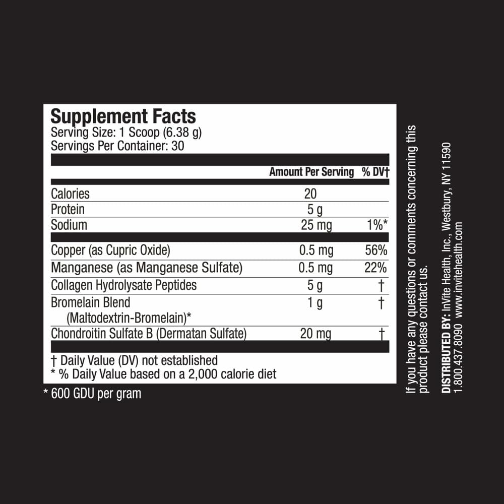 2 > KEY INGREDIENTS: Supplying clinically studied Collagen Hydrolysate Peptides plus Dermatan Sulfate to support the strength, elasticity and health of ligaments and tendons. Also offers pineapple-sourced Bromelain for comfort, and a small amount of Copper and Manganese which are important for the structure of ligaments and tendons