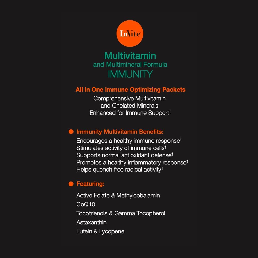 DESCRIPTION : MULTIVITAMIN SUPPLEMENT: InVIte Immunity Multivitamin is a comprehensive formula that offers all of the benefits of the Core Multivitamin with the addition of advanced immune support nutrients, elderberry and nucleotides