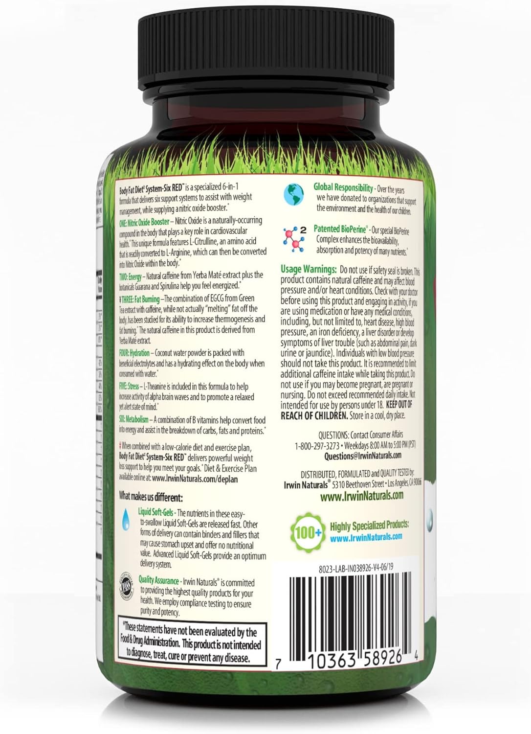 About this item 6-IN-1 FORMULA - Body Fat Diet System-Six RED is a 6-in-1 formula that delivers six support systems to assist with weight management, including nitric oxide, energy, fat burning, hydration, relaxation & metabolism. NITRIC OXIDE BOOST - L-Citrulline is readily converted into L-arginine, which can then be converted into nitric oxide in the body. Nitric oxide plays a key role in cardiovascular health by enhancing blood flow & helping you perform at your best. ENERGY & FAT BURNING - Natural caffeine from yerba mate extract, guarana, and spirulina help you feel energized. Plus, this formula’s ingredients have been studied for their ability to increase thermogenesis & fat burning. HYDRATION & RELAXATION - Coconut water powder is packed with beneficial electrolytes & has a hydrating effect. L-theanine is included to help promote a relaxed yet alert state of mind. METABOLISM - A combination of B vitamins help convert food into energy and assist in the breakdown of carbs, fats, and proteins. ADVANCED DELIVERY SYSTEM - Our advanced, easy-to-swallow liquid soft-gels include our special Bioperine Complex, which enhances the bioavailability, absorption, and potency of many nutrients.  See more product details,6-IN-1 FORMULA - Body Fat Diet System-Six RED is a 6-in-1 formula that delivers six support systems to assist with weight management, including nitric oxide, energy, fat burning, hydration, relaxation & metabolism,NITRIC OXIDE BOOST - L-Citrulline is readily converted into L-arginine, which can then be converted into nitric oxide in the body. Nitric oxide plays a key role in cardiovascular health by enhancing blood flow & helping you perform at your best,ENERGY & FAT BURNING - Natural caffeine from yerba mate extract, guarana, and spirulina help you feel energized. Plus, this formula’s ingredients have been studied for their ability to increase thermogenesis & fat burning,HYDRATION & RELAXATION - Coconut water powder is packed with beneficial electrolytes & has a hydrating effect. L-theanine is included to help promote a relaxed yet alert state of mind,METABOLISM - A combination of B vitamins help convert food into energy and assist in the breakdown of carbs, fats, and proteins,ADVANCED DELIVERY SYSTEM - Our advanced, easy-to-swallow liquid soft-gels include our special Bioperine Complex, which enhances the bioavailability, absorption, and potency of many nutrients