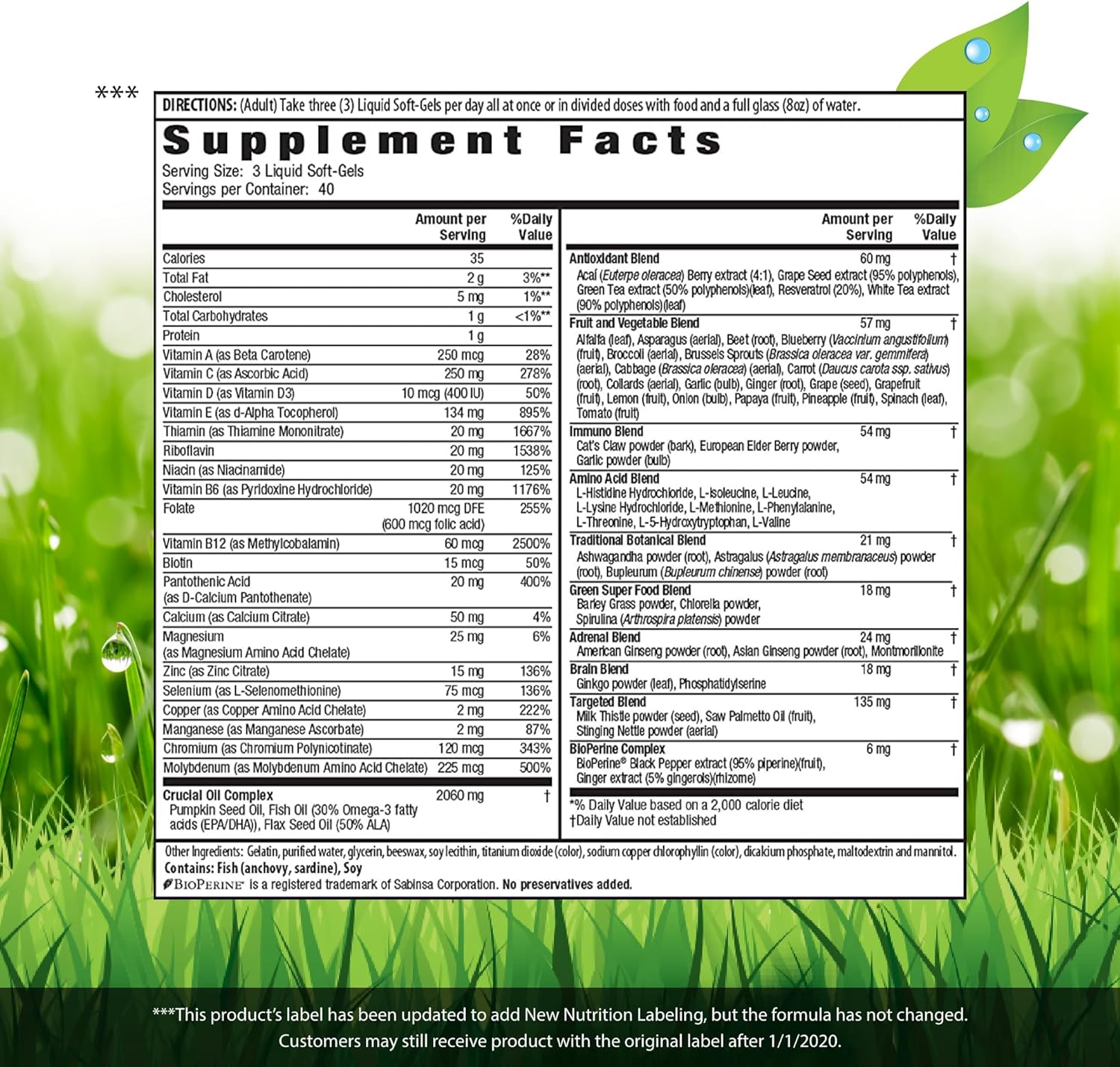 Full Spectrum Support - Breakthrough Formula Combines Over 70 Nutrients, Vitamins And Minerals That Cover The Following 12 Categories: Full-Spectrum Vitamins, Minerals, Crucial Oil Complex, Antioxidant Blend, Fruit & Vegetables Blend, Immuno Blend, Amino Acid Blend, Traditional Botanical Blend, Green Super Food Blend, Adrenal Blend, Brain Blend And Targeted Blend