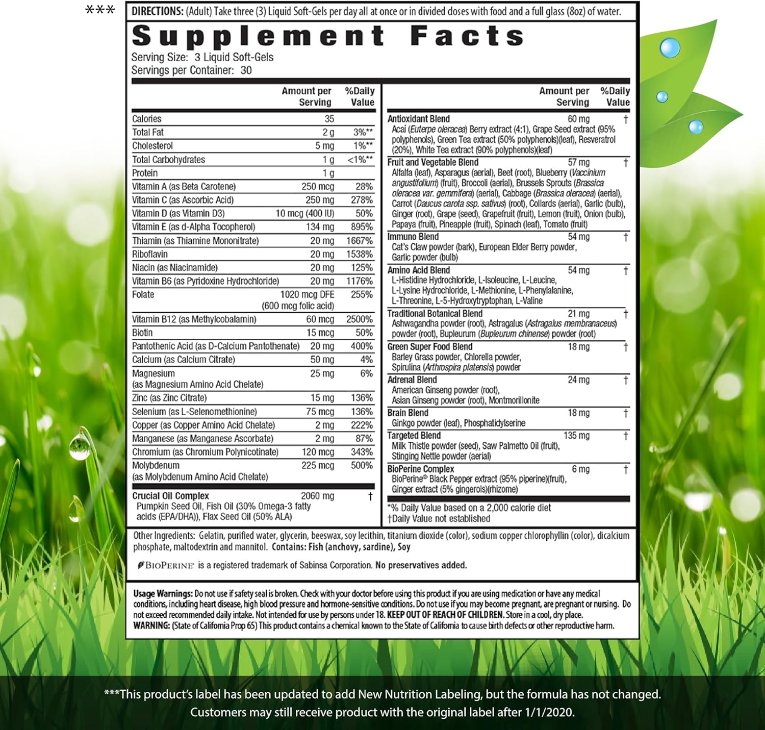 Full Spectrum Support - Breakthrough Formula Combines Over 70 Nutrients, Vitamins And Minerals That Cover The Following 12 Categories: Full-Spectrum Vitamins, Minerals, Crucial Oil Complex, Antioxidant Blend, Fruit & Vegetables Blend, Immuno Blend, Amino Acid Blend, Traditional Botanical Blend, Green Super Food Blend, Adrenal Blend, Brain Blend And Targeted Blend