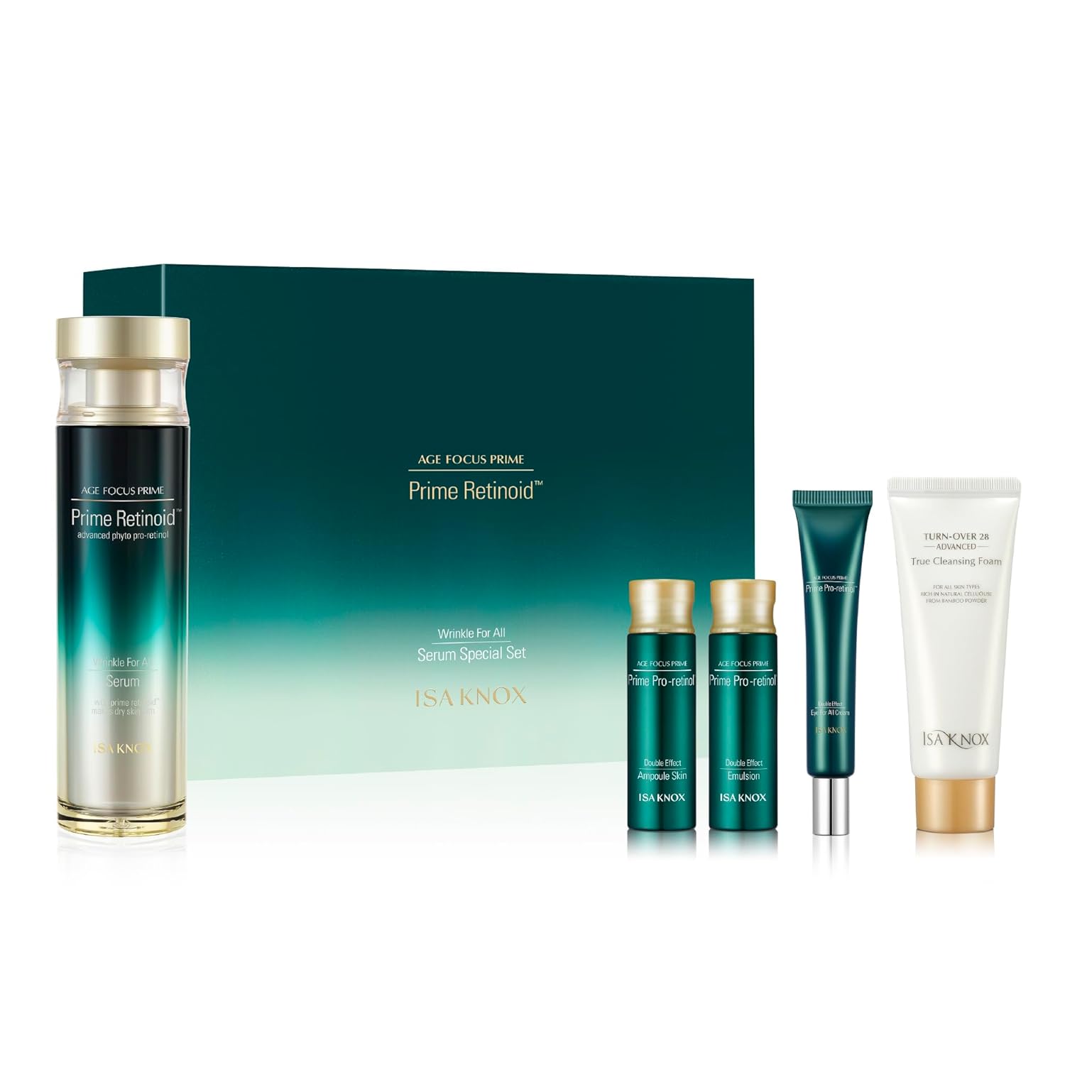 About this item ISA KNOX AGE FOCUS PRIME WRINKLE FOR ALL SERUM SPECIAL SET - Age Focus Prime Wrinkle For All Serum (50 ml/1.69 fl oz), Age Focus Prime Double Effect Ampoule Skin Toner (20 ml/0.68 fl oz), Age Focus Prime Double Effect Emulsion (20 ml/0.68 fl oz), Age Focus Prime Double Effect Eye For All Cream (15 ml/0.51 fl oz) & Turnover28 AD True Cleansing Foam (40 ml/1.36 fl oz) PRIME HOLE TECHNOLOGY - Formulation backed by science, this highly absorbent formula encapsulates active ingredients in Squalane allowing deeper and better penetration into the skin to deliver firming, moisturizing, and illuminating benefits PLANT-BASED PREMIUM SKINCARE SOLUTION - Prime Pro-Retinol + Phyto-DNA + Ornithine - Containing mainly plant-based ingredients known to hydrate and rejuvenate the skin layers, Prime Pro-Retinol, built to tackle all signs of skin aging, this patented ingredient is a natural Retinol precursor making it safe to use twice a day, morning and night ISA KNOX - Having made its launch in 1995, Isa Knox had a vision to revolutionize the skincare industry by providing proven solutions to the main skin concern for most women; signs of aging. With that one ultimate goal in mind, Isa Knox started its Halve The Skin Age Project which then brought its first innovation, Wrinkle Decline, the first Korean cosmetics line with an aging solution LG BEAUTY- Proudly a part of LG H&H, bringing you effective skincare and products to elevate your life through patented ingredients and LG’s forefront of science, technology, and expertise. See more product details,ISA KNOX AGE FOCUS PRIME WRINKLE FOR ALL SERUM SPECIAL SET - Age Focus Prime Wrinkle For All Serum (50 ml/1.69 fl oz), Age Focus Prime Double Effect Ampoule Skin Toner (20 ml/0.68 fl oz), Age Focus Prime Double Effect Emulsion (20 ml/0.68 fl oz), Age Focus Prime Double Effect Eye For All Cream (15 ml/0.51 fl oz) & Turnover28 AD True Cleansing Foam (40 ml/1.36 fl oz),PRIME HOLE TECHNOLOGY - Formulation backed by science, this highly absorbent formula encapsulates active ingredients in Squalane allowing deeper and better penetration into the skin to deliver firming, moisturizing, and illuminating benefits,PLANT-BASED PREMIUM SKINCARE SOLUTION - Prime Pro-Retinol + Phyto-DNA + Ornithine - Containing mainly plant-based ingredients known to hydrate and rejuvenate the skin layers, Prime Pro-Retinol, built to tackle all signs of skin aging, this patented ingredient is a natural Retinol precursor making it safe to use twice a day, morning and night,ISA KNOX - Having made its launch in 1995, Isa Knox had a vision to revolutionize the skincare industry by providing proven solutions to the main skin concern for most women; signs of aging. With that one ultimate goal in mind, Isa Knox started its Halve The Skin Age Project which then brought its first innovation, Wrinkle Decline, the first Korean cosmetics line with an aging solution,LG BEAUTY- Proudly a part of LG H&H, bringing you effective skincare and products to elevate your life through patented ingredients and LG’s forefront of science, technology, and expertise