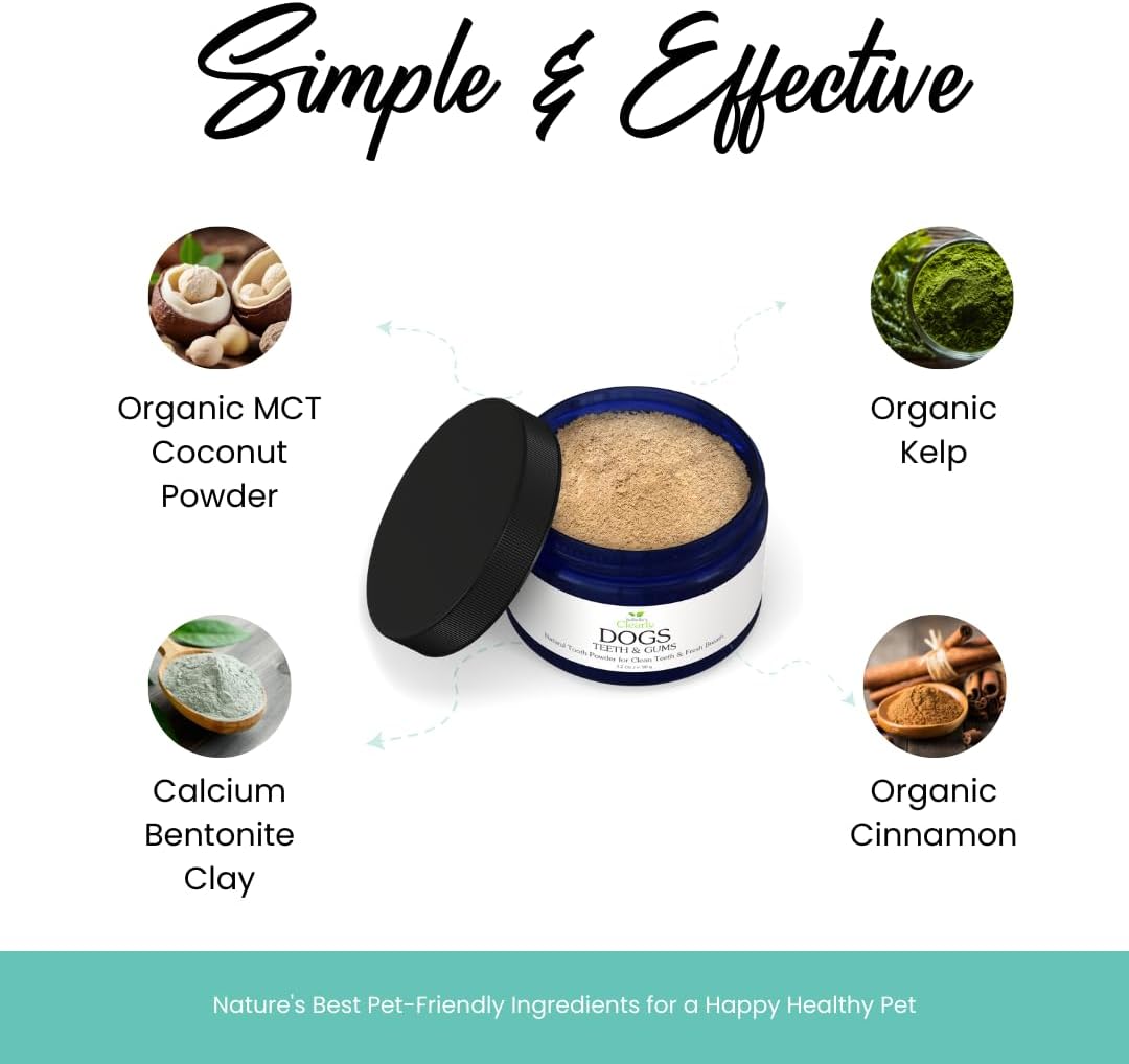 Teeth cleaning for dogs is a must. When food particles cling to dogs' teeth and gums, plaque buildup will form, causing inflamed gums, periodontal issues, potential loss of teeth and bad breath. Because dogs will most likely ingest whatever you use to clean their teeth, it’s essential that the toothpaste you choose is food grade and free of ingredients that could potentially be toxic to your pet. Our human grade leave on tooth powder for dogs, made with MCT coconut oil, organic kelp, calcium bentonite clay and organic cinnamon powder, is natural, effective and tasty! HUMAN GRADE INGREDIENTS – Our natural and organic remineralizing toothpaste for dogs is effective and made with the best human grade ingredients, and is free of toxic ingredients. Our tooth powder is glycerin free, xylitol free, baking soda free, chemical free, gluten free, fluoride free, paraben free, synthetic free, preservative free and animal byproducts free. It’s a safe and organic toothpaste for dog dental care. INSTANT FRESH BREATH – Rather than masking the bad breath with a stinky meat or chicken flavor, our fast acting natural toothpaste for dogs is made for dogs with bad breath, to eliminate the smell at the source using natural clays, enzymes, oils and spices. The tasty cinnamon flavor will keep your pet's mouth clean and fresh all day long. An alternative to an enzymatic toothpaste for dogs that is more natural and effective. CLEANS TEETH & GUMS – Advanced natural ingredients are gentle on the teeth and gums, yet highly effective in teeth whitening, eliminating surface stains, tartar remover, remineralizing the teeth and soothing the gums. EASY TO USE – Our water free formula is a rinse free and leave on toothpaste, free of unnecessary preservatives and is a lot less messy! Simply dip the toothbrush in a little bit of water or coconut oil to make it damp, add a little powder then gently brush your dog’s teeth for natural dog dental care. Whether you have an elderly dog, a dog with sensitive stomach, a dog with bad breath, a large breed dog, a medium breed dog, a small breed dog, our dental toothpaste for dogs is a must have for easy oral care. A BRAND YOU CAN TRUST – Pet parents love us because they know how much we love our furry friends. Our pet safe human grade products are made with the best natural ingredients available, are researched extensively to ensure they do what they say they do, and are made in small batches in the USA, NATURAL AND ORGANIC TOOTHPASTE FOR DOGS – Brushing a dog’s teeth can be tricky because dogs will ingest whatever you use. Our effective and natural tooth powder for dogs is made with organic human grade ingredients and is free from xylitol, glycerin, baking soda, chemicals, pesticides, glutens, fluoride, parabens, detergents, synthetics, preservatives and animal byproducts, INSTANT FRESH BREATH – Rather than masking the bad breath with stinky meat and chicken flavors, our fast acting natural tooth powder for dogs with bad breath effectively eliminates bad breath at the source using natural clays, enzymes, oils and spices. The tasty cinnamon flavor will keep your pet's mouth clean and fresh all day long. If you’re looking for an enzymatic toothpaste for dogs, look no further and give our organic remineralizing tooth powder a try!, NATURAL TEETH CLEANING FOR DOGS – Advanced natural ingredients, including coconut MCT powder, acacia fiber, organic kelp powder, calcium bentonite clay, and organic cinnamon, are gentle on the teeth and gums, yet highly effective in eliminating surface stains, removing tartar and plaque, teeth whitening, remineralizing and strengthening the teeth, and soothing the gums, EASY TO USE LEAVE ON TOOTH POWDER – Our formula is water free making it completely free of unnecessary additives and preservatives, and also a lot less messy! Simply dip the toothbrush in a little bit of water or coconut oil to make it damp, add a little powder to the toothbrush then gently brush your dog’s teeth at a 45 degree angle while massaging the gums. Our toothpaste is ideal for elderly dogs, small breed dogs, medium breed dogs and large breed dogs, A BRAND YOU CAN TRUST – Pet parents love us because they know how much we love our furry friends. Our pet safe human-grade products are made with the best natural ingredients available, are researched extensively to ensure they do what they say they do, and are made in small batches in the USA. Our products are certified vegan and cruelty free, and are good for people, pets and the planet