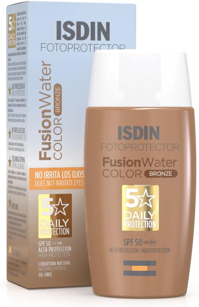 ISDIN Fusion Water Color SPF 50 (Bronze) 50ml, Tinted daily facial sun cream, Ultra-light texture