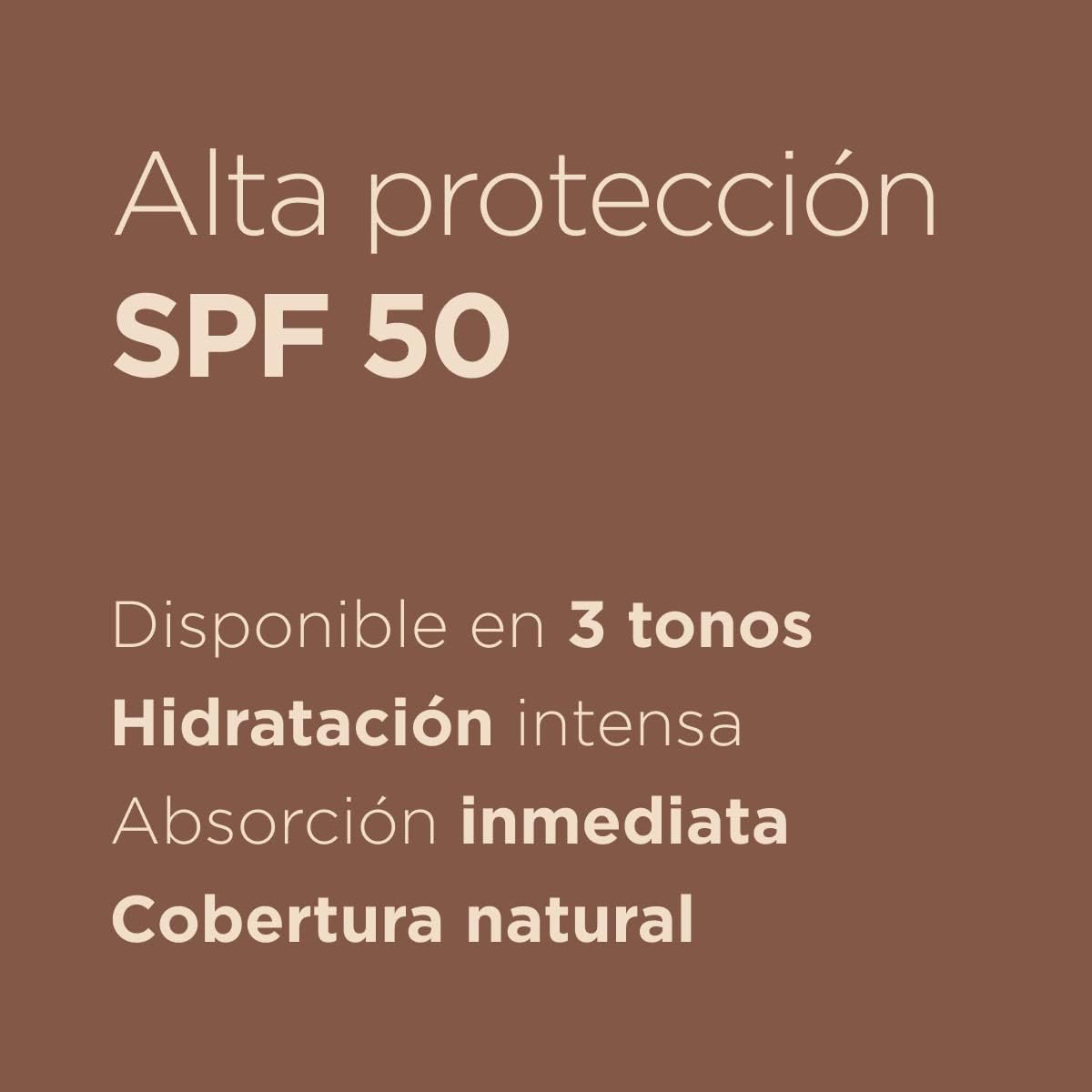 Natural coverage. Very high protection with SPF50, UVA and UVB