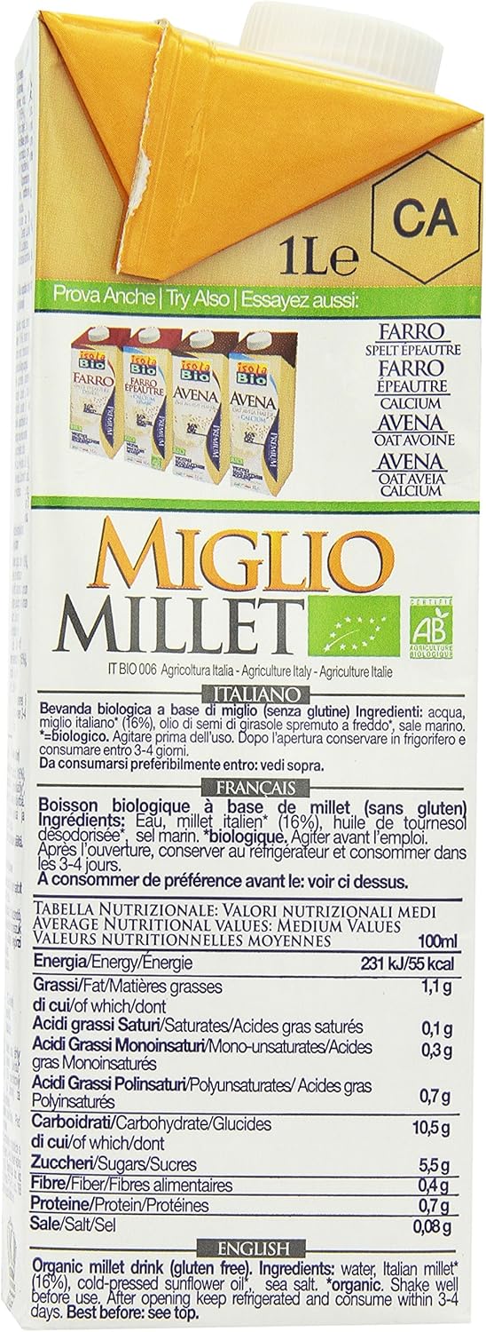 Product Description Isola bio millet drink is ideal for gluten intolerant that do not want to give up sweetness and goodness. It is ideal for breakfast and for preparing gluten-free dishes and recipes. It is highly nutritious because millet is a very popular organic grain that tastes naturally sweet. Ingredients Water, Italian millet*(16%), cold-pressed sunflower oil*, sea salt (*organic) P.when('A').execute(function(A) { A.on('a:expander:toggle_description:toggle:collapse', function(data) { window.scroll(0, data.expander.$expander[0].offsetTop-100); }); }); Directions Use as directed Box Contains Each order comes with 4 x Isola Bio Organic Millet Drink 1 Litre Manufacturer Contact Information Abafoods Srl, Via Ca' Mignola, Nuova, 1775, Badia Polesine RO, Italy. See more,Give up sweetness and goodness,Ideal for breakfast and for preparing dishes and recipes,Highly nutritious and naturally sweet