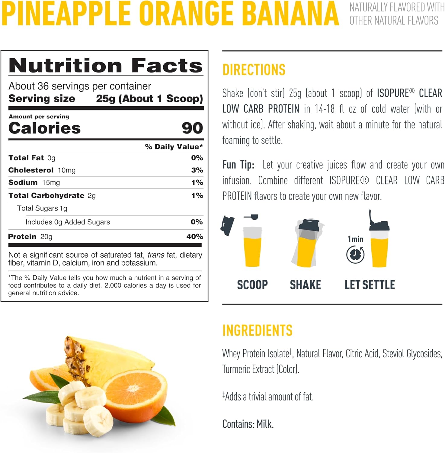 About this item One 1.9 lb container (36 servings) of Isopure 100% Pure Whey Isolate Protein Powder Infusions in dynamically delicious Pineapple Orange Banana flavor 20 grams of 100% pure whey protein isolate powder in a clear protein drink is the ideal choice for healthy adults looking to maintain a high-protein intake to meet their daily protein needs Stick to your wellness goals with a delicious protein drink designed to help supplement your protein intake with simple ingredients, pure protein, and tasty flavor With zero added sugar, this pineapple orange banana flavored protein powder still tastes delicious when mixed with 10-16 fl oz of cold water Supporting everyday nutrition and post workout recovery is easy for any lifestyle thanks to the blend of five ingredients in Isopureās tasty protein supplement See more product details,One 1.9 lb container (36 servings) of Isopure 100% Pure Whey Isolate Protein Powder Infusions in dynamically delicious Pineapple Orange Banana flavor,20 grams of 100% pure whey protein isolate powder in a clear protein drink is the ideal choice for healthy adults looking to maintain a high-protein intake to meet their daily protein needs,Stick to your wellness goals with a delicious protein drink designed to help supplement your protein intake with simple ingredients, pure protein, and tasty flavor,With zero added sugar, this pineapple orange banana flavored protein powder still tastes delicious when mixed with 10-16 fl oz of cold water,Supporting everyday nutrition and post workout recovery is easy for any lifestyle thanks to the blend of five ingredients in Isopureās tasty protein supplement
