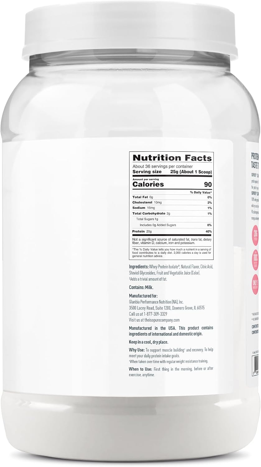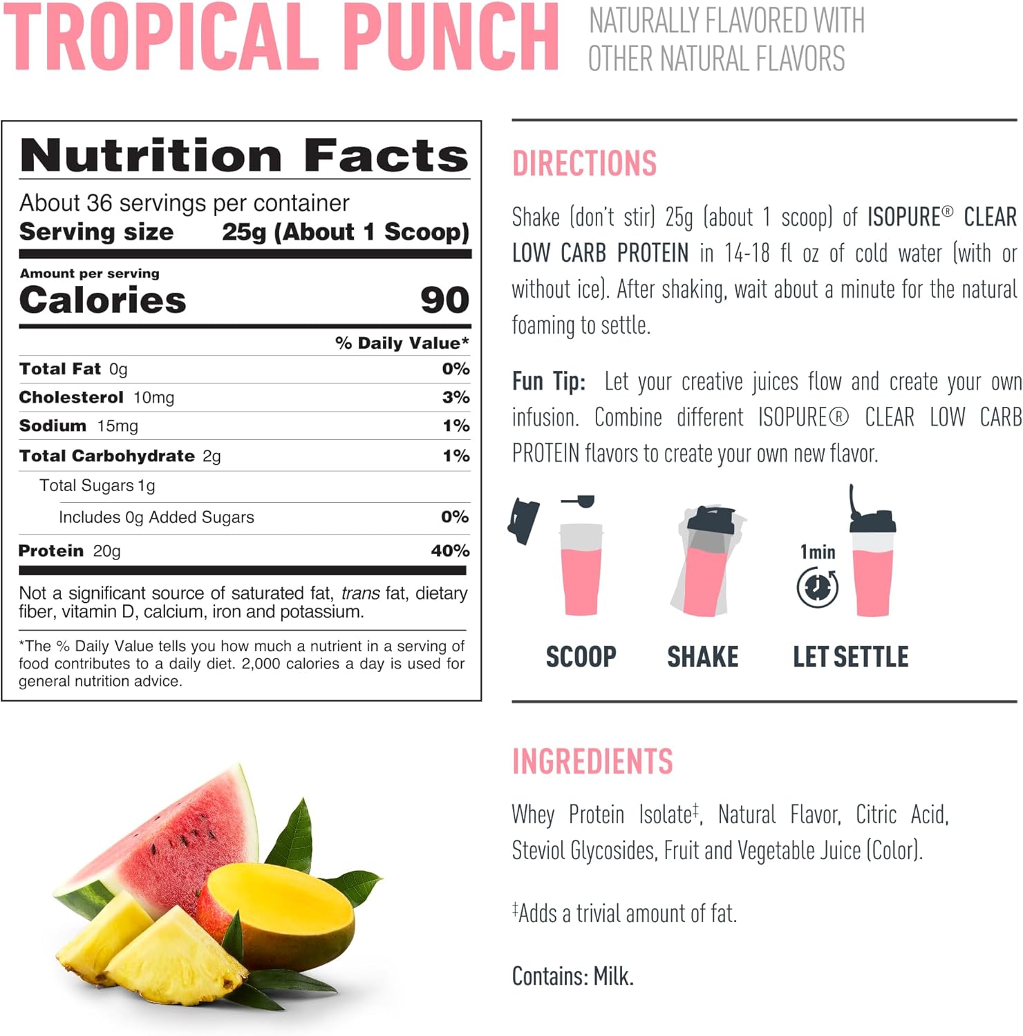 About this item One 1.9 lb bottle (36 servings) of Isopure 100% Pure Whey Isolate Protein Powder Infusions in dynamically delicious Tropical Punch flavor 20 grams of 100% pure whey protein isolate powder in a clear protein drink is the ideal choice for healthy adults looking to maintain a high-protein intake to meet their daily protein needs Stick to your wellness goals with a delicious protein drink designed to help supplement your protein intake with simple ingredients, pure protein, and tasty flavor With zero added sugar, this tropical punch flavored protein powder still tastes delicious when mixed with 10-16 fl oz of cold water Supporting everyday nutrition and post workout recovery is easy for any lifestyle thanks to the blend of five ingredients in Isopureās tasty protein supplement See more product details,One 1.9 lb bottle (36 servings) of Isopure 100% Pure Whey Isolate Protein Powder Infusions in dynamically delicious Tropical Punch flavor,20 grams of 100% pure whey protein isolate powder in a clear protein drink is the ideal choice for healthy adults looking to maintain a high-protein intake to meet their daily protein needs,Stick to your wellness goals with a delicious protein drink designed to help supplement your protein intake with simple ingredients, pure protein, and tasty flavor,With zero added sugar, this tropical punch flavored protein powder still tastes delicious when mixed with 10-16 fl oz of cold water,Supporting everyday nutrition and post workout recovery is easy for any lifestyle thanks to the blend of five ingredients in Isopureās tasty protein supplement