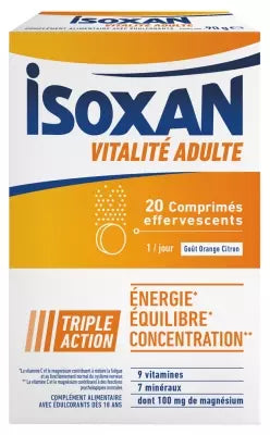 Isoxan Vitality Adult 20 Effervescent Tablets Is A Food Supplement With Triple Action To Reduce Fatigue And Contribute To Energy Production. It Contains: Vitamins B2, B5, B6, B9, B12, C, Iron And Magnesium That Contribute To Reduce Fatigue, Vitamins B1, B2, B5, B6, B12, C, Iron, Copper, Magnesium And Manganese That Contribute To Normal Energy Metabolism, Vitamins C, B1, B2, B6, B12, And Magnesium And Copper That Contribute To Normal Functioning Of Nervous System, Vitamins C, B1, B6, B9, B12 And Magnesium That Contribute To Normal Psychological Functions (Learning, Concentration, Memory)