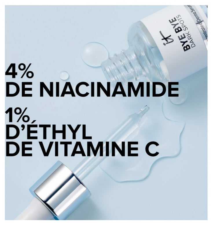 It Cosmetics Bye Bye Dark Spots Anti-Dark Spot Concentrated Serum 30 Ml Is A Skin Care Product That Visibly Reduces The Color Intensity Of Dark Spots On The Face, Neck And Chest. It Is Formulated With : 4% Niacinamide, Which Visibly Reduces Blackheads And Discoloration, 1% Ethyl Vitamin C, Which Visibly Improves Skin Radiance. Suitable For All Skin Types, Even Sensitive. Dermatologically Tested
