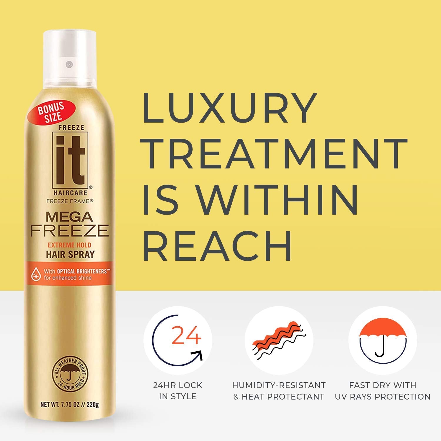 UV AND WEATHER PROTECTANT: The IT MEGA Freeze Hair Spray will keep your hair in place no matter the weather - it is humidity resistant, as well as protects your hair from harmful UV rays that can cause damage to your hair