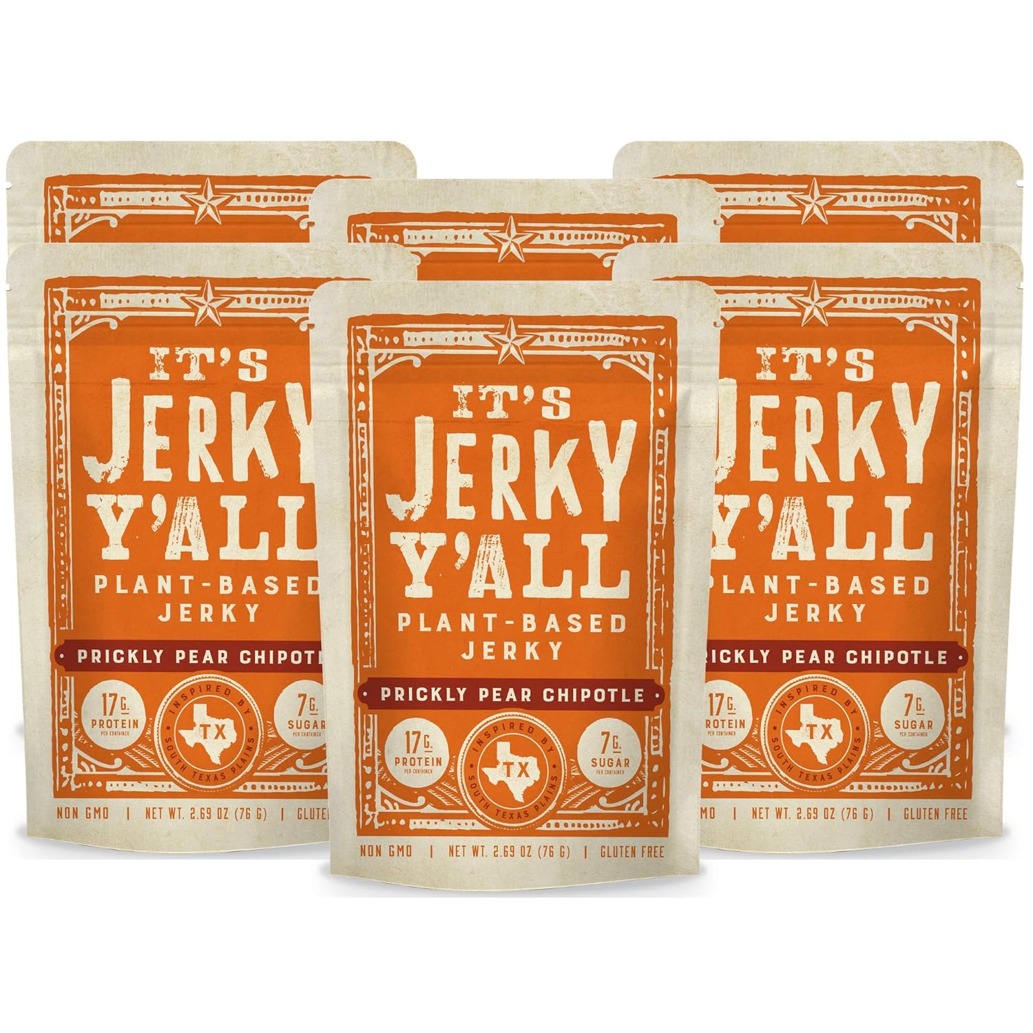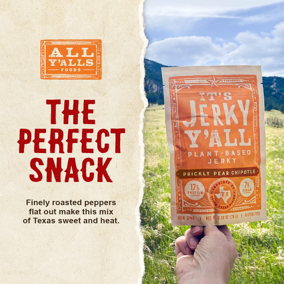 HEALTHY VEGAN CHOICE - We use certified non-GMO whole soybeans and all natural ingredients with no trans fat or cholesterol. Our plant-based meatless jerky is clean protein you can count on10TENDER AND TASTY - Healthy, yummy, chewy texture and delicious taste of traditional jerky that is impossible to beat! Provides the nine essential amino acids we need, PLUS vitamins, minerals, antioxidants, and phytochemicals10DIET-FRIENDLY - Suitable for vegan, vegetarian, gluten-free, non-GMO, and Whole30 diets. Our delicious Chipotle flavor contains 7 grams of protein and 4 grams of fiber per serving, plus vitamins A and C, calcium, and iron. Our jerky makes for a healthy and delicious low carb snack10GIVE BACK - A portion of each sale of It’s Jerky Y’All supports the Rowdy Girl Sanctuary in Texas, which is a cattle ranch-turned vegan sanctuary with the largest herd of rescued cows in the state of Texas10MADE IN USA - It’s Jerky Y’all is made right here in Texas, with flavors inspired by our great state. Our clean recipes feature plants special to Texas, from the prickly pear to the pecan to the chipotle pepper10