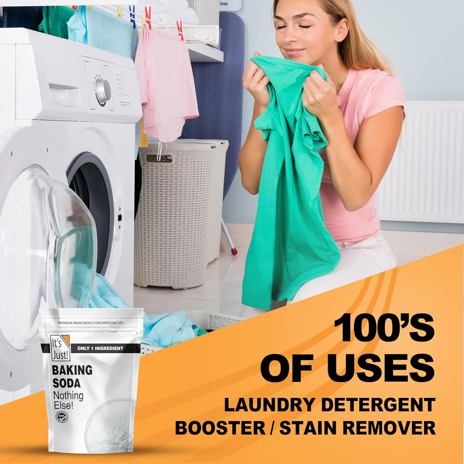 About this item 100% Sodium Bicarbonate / It's just pure sodium bicarbonate with no additives and no fillers. Combine with citric acid to make your own fizzy bath bombs. Food Grade / Perfect for use in your recipes and naturally gluten free to boot. Cleaning & Deodorizing / Safely remove tough stains in the bathroom. Use it on sinks, showers, toilets, counters, tubs, tile, grout and more. Add one cup to a load of laundry for cleaner fresher clothes. Made in the USA / The baking soda is made in the USA and it is also packaged in the USA. Each batch is 3rd party lab tested to ensure purity. Premium Quality / All of our It's Just! products are packaged in the USA (California) at our GMP Certified facility See more product details,100% Sodium Bicarbonate / It's just pure sodium bicarbonate with no additives and no fillers. Combine with citric acid to make your own fizzy bath bombs,Food Grade / Perfect for use in your recipes and naturally gluten free to boot,Cleaning & Deodorizing / Safely remove tough stains in the bathroom. Use it on sinks, showers, toilets, counters, tubs, tile, grout and more. Add one cup to a load of laundry for cleaner fresher clothes,Made in the USA / The baking soda is made in the USA and it is also packaged in the USA. Each batch is 3rd party lab tested to ensure purity,Premium Quality / All of our It's Just! products are packaged in the USA (California) at our GMP Certified facility