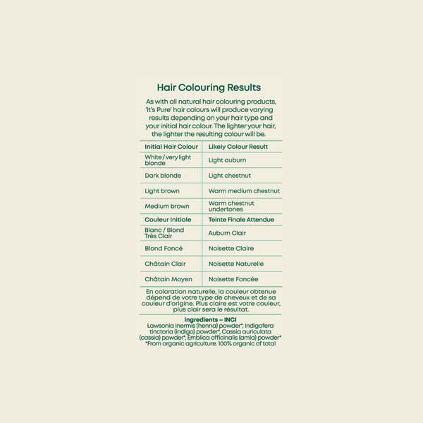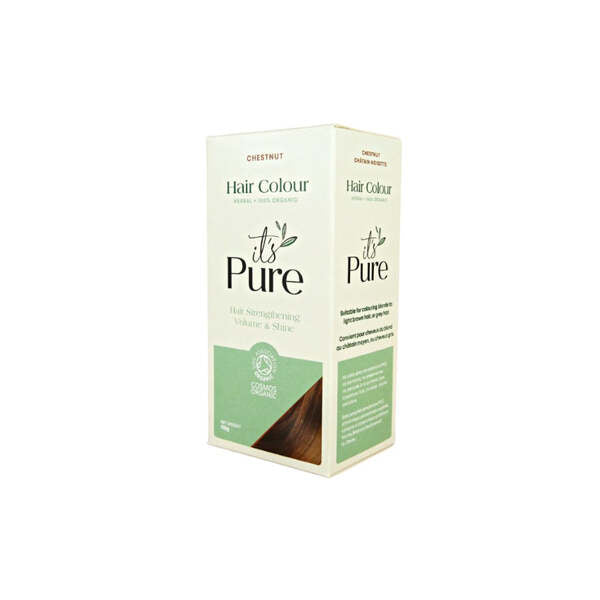 Product Information:Suitable for colouring blonde to light-mid brown hair. A 100% certified organic & natural Chestnut Hair Dye that is gentle on sensitive skin and can revitalise dry / damaged hair, boosting volume and shine,Features:It’s Pure 100% natural Chestnut Hair Colour is made entirely from botanical extracts, and is free from PPD, ammonia, peroxide and all artificial chemicals,Warning or Restrictions:Many customers who are allergic to conventional hair dye happily use It's Pure. Our hair colours are natural and henna-based, without PPD, peroxide, ammonia, resorcinol or any artificial chemicals. However, we cannot guarantee that you will not be allergic. This is the same as with many natural products, such as nuts or strawberries that people may have allergic reactions to even though they are only natural. To be sure of whether you will react to a hair colour it is best to perform a patch test 48 hours before putting the product on your scalp. To do a patch test, put a small amount of dye on the inside of your elbow. If any reaction occurs (itching, flakiness, redness) you may have a reaction to the hair colour,Product Specification:INCI: Lawsonia inermis (henna) powder*, Indigofera tinctoria (indigo) powder*, Cassia auriculata (cassia)powder*, Emblica officinalis (amla) powder*. *Certified organic (100% of product),Product Uses:It’s Pure hair dyes are simple to use. Full instructions and tips (plus gloves and a cap) are enclosed in the box, but here is a brief how-to:,Recyclable:Box, leaflet and bag: please put in your paper recycling. Gloves and cap: Once dry, suitable for most household plastic recycling,Tips and Advice:A few other things to bear in mind when using It’s Pure hair colour: