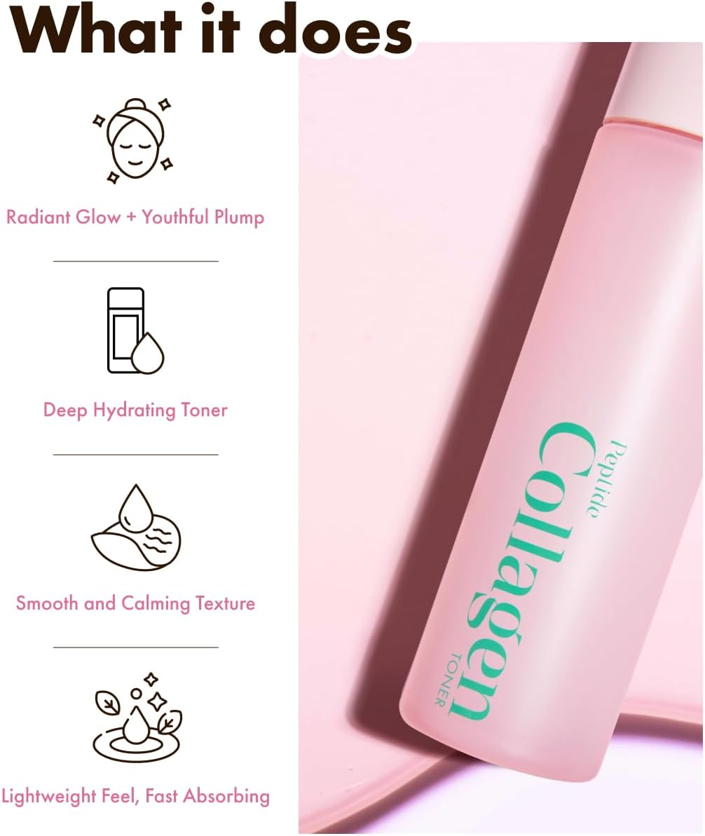 About this item DEEP HYDRATION. This beauty collagen toner has a mild formula that provides deep hydration to your skin, leaving it feeling smooth and supple. It effectively restores the moisture balance of your skin which is essential for maintaining a well-hydrated and youthful-looking complexion. FIRMING POWER. This face toner contains vegan collagen and oat peptide that work together to improve wrinkles and increase skin elasticity. Regular use of this toner can help improve skin firmness and reduce the appearance of fine lines and wrinkles. RICH NUTRIENTS. The pinkish moisturizing texture of this hydrating toner is packed with rich nutrients that heal dry and damaged skin. The toner is formulated with ingredients that are designed to nourish your skin and support its overall wellness. VEGAN & HYPOALLERGENIC. This organic collagen skin toner is formulated without 10 harsh ingredients and is vegan-friendly, making it an ethical and skin-friendly choice. Its hypoallergenic and mild formula hydrates, firms, and soothes your skin to achieve a glowing complexion. DEEP CLEANSING. This Korean toner gently but effectively removes impurities and excess oil while moisturizing your skin. Its deep cleansing and alcohol-free formula will leave your skin feeling clean, refreshed, and revitalized. See more product details,DEEP HYDRATION. This beauty collagen toner has a mild formula that provides deep hydration to your skin, leaving it feeling smooth and supple. It effectively restores the moisture balance of your skin which is essential for maintaining a well-hydrated and youthful-looking complexion,FIRMING POWER. This face toner contains vegan collagen and oat peptide that work together to improve wrinkles and increase skin elasticity. Regular use of this toner can help improve skin firmness and reduce the appearance of fine lines and wrinkles,RICH NUTRIENTS. The pinkish moisturizing texture of this hydrating toner is packed with rich nutrients that heal dry and damaged skin. The toner is formulated with ingredients that are designed to nourish your skin and support its overall wellness,VEGAN & HYPOALLERGENIC. This organic collagen skin toner is formulated without 10 harsh ingredients and is vegan-friendly, making it an ethical and skin-friendly choice. Its hypoallergenic and mild formula hydrates, firms, and soothes your skin to achieve a glowing complexion,DEEP CLEANSING. This Korean toner gently but effectively removes impurities and excess oil while moisturizing your skin. Its deep cleansing and alcohol-free formula will leave your skin feeling clean, refreshed, and revitalized
